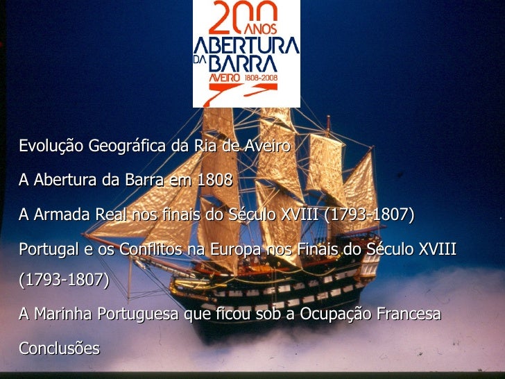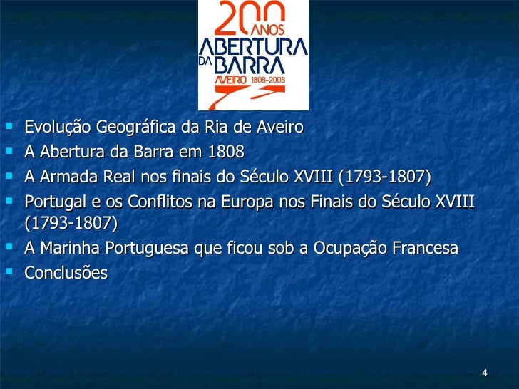 4. 4. <ul><li>Evolução Geográfica da Ria de Aveiro </li></ul><ul><li>A Abertura da Barra em 1808 </li></ul><ul><li>A Armada Real nos finais do Século XVIII (1793-1807) </li></ul><ul><li>Portugal e os Conflitos na Europa nos Finais do Século XVIII (1793-1807) </li></ul><ul><li>A Marinha Portuguesa que ficou sob a Ocupação Francesa </li></ul><ul><li>Conclusões </li></ul>