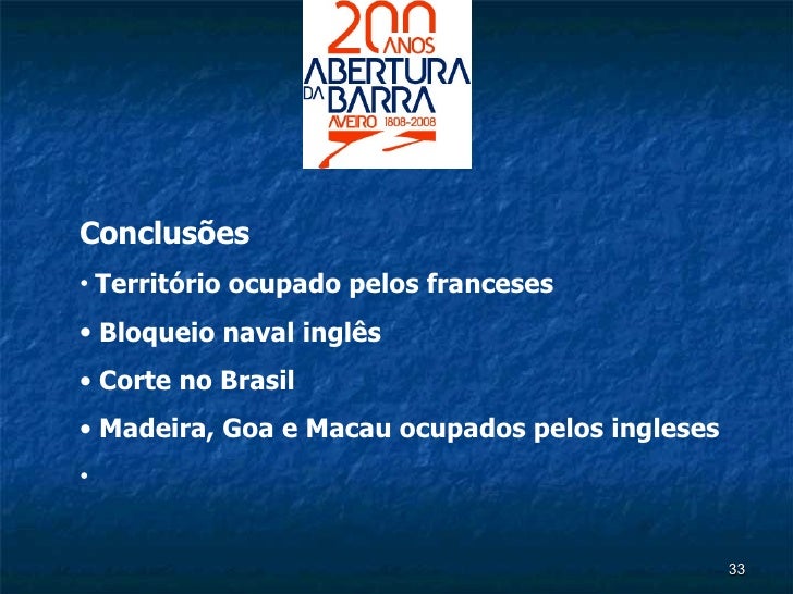 29. 33. <ul><li>Conclusões </li></ul><ul><li>Território ocupado pelos franceses </li></ul><ul><li>Bloqueio naval inglês </li></ul><ul><li>Corte no Brasil </li></ul><ul><li>Madeira, Goa e Macau ocupados pelos ingleses </li></ul>