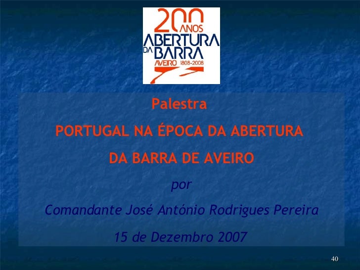 31. 40. Palestra PORTUGAL NA ÉPOCA DA ABERTURA DA BARRA DE AVEIRO por Comandante José António Rodrigues Pereira 15 de Dezembro 2007