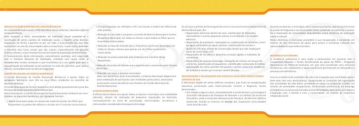 10. 10. 17 18 REQUALIFICAÇÃO E REFORÇO DA HABITAÇÃO SOCIAL > Comparticipação nas refeições e ATL nas escolas e Jardins-de-infância da Os serviços a prestar, de forma gratuita com os recursos humanos disponíveis da Quanto aos demais, o município, seja a expensas próprias, seja em parceria com Ao nível da habitação social, o PSD identifica várias carências, havendo urgência rede pública. Câmara Municipal, são: as juntas de freguesia e ou associações locais, pretende recuperá-los e colocá- na sua satisfação. > Reparações eléctricas dentro de casa: substituição de lâmpadas; los à disposição da comunidade enquadrados numa dinâmica de promoção > Redução da inscrição e propinas na Escola de Musica Municipal e Centro Para resposta a estas necessidades de habitação social propõem-se a interruptores e outras pequenas avarias na instalação e no quadro social e cultural. Desportivo Municipal, em todas as classes e para todos os filhos que se eléctrico. construção de vários núcleos de habitação social, a repartir pelas diversas Nessa dinâmica, o município procederá à sua recuperação e conversão em encontrem matriculados. > Reparações de pichelaria: reparações ou substituição de torneiras; canos freguesias, de forma a garantir-se por um lado a manutenção dos que dela centros de dia; estruturas de apoio para jovens e iniciativas culturais das necessitam no seio da comunidade onde se encontram, e pelo outro, defender > Redução na taxa de entrada para a frequência na Piscina Municipal, em de água; infiltrações de águas pluviais; substituição de sanitas e comunidades em que estão inseridos. o concelho dos riscos sociais que são visíveis, especialmente em grandes todas as classes, mesmo que apenas um dos filhos se encontre lavatórios em mau estado de conservação desde que não impliquem centros urbanos, e que resultam da concentração de população desfavorecida. matriculado. obras de construção civil. O financiamento desta intervenção, naturalmente avultada, será negociado > Reparações de serralharia: pequenos arranjos ligados a trabalhos de RESIDÊNCIA AUTÓNOMA. > Redução do preço praticado pela Autarquia na iniciativa Férias serralharia. com o Instituto Nacional de Habitação, entidade com quem estão já A residência autónoma é uma acção a desenvolver em parceria com a Desportivas. > Reparações de pequena bricolage: colocação de silicone em louças de estabelecidos muitos contactos e que manifestou já o seu apoio quer para a Cooperativa Mondim + Social, beneficiando do apoio do POPH – Programa > Redução do preço de bilhetes para espectáculos a promover pela Câmara sanitários; substituição de puxadores; substituição e colocação de telhas; Operacional do Potencial Humano, em que será constituída uma estrutura requalificação da habitação social existente na sede do concelho, quer para o substituição de vidros partidos em janelas e portas; pequenas mudanças reforço, nomeadamente nas demais freguesias. Municipal. residencial, com alojamento e apoio residencial permanente ou temporário a de mobiliário desde que ocorram dentro de casa. pessoas com deficiência. CARTÃO MUNICIPAL DE FAMÍLIA NUMEROSA > Redução nas taxas e licenças municipais. O Cartão Municipal de Família Numerosa destina-se a apoiar todos os Além dos benefícios atrás mencionados, a Câmara Municipal diligenciará RECUPERAÇÃO E VALORIZAÇÃO DOS EDIFÍCIOS ESCOLARES DESACTIVADOS Visa-se a melhoria de condições de vida e de ocupação que contribuam para o agregados familiares, com três ou mais filhos, residentes no concelho de pela celebração de protocolos com entidades particulares, destinados CENTROS DE DIA. bem-estar dos seus destinatários, assegurando-se condições de organização Mondim de Basto. acrescentar outros benefícios aos titulares do Cartão Municipal de O Município dispõe de vários edifícios escolares, que fruto da reorganização das actividades da vida diária, prestando-se apoio na integração escolar, em O Cartão Municipal da Família Numerosa será obtido gratuitamente junto dos Família Numerosa. educativa promovida pela Administração Central e Regional, foram centros de actividades ocupacionais, na formação profissional, no emprego Serviços de Acção Social da Câmara Municipal. desactivados. protegido ou no acesso ao mercado normal de trabalho, bem como, privilegiar a OFICINA DOMICILIÁRIA Numa fase inicial, o Cartão Municipal de Família Numerosa atribuirá aos seus > Em relação a alguns casos, nomeadamente a Escola da Serra, já entregue à integração com a família e com a comunidade, no sentido da respectiva A Oficina Domiciliária visa apoiar todos os idosos e munícipes com mobilidade Comissão Fabriqueira da Paróquia de Mondim e ao edifício da Escola de titulares os seguintes benefícios, por agregado familiar: integração social. reduzida, através da realização de pequenas reparações ao domicílio, Carvalhais, onde a Comissão Fabriqueira da Paroquia de Atei tem idêntica > Bolsa anual para ajuda na compra de material escolar aos filhos que nomeadamente ao nível de canalização, electricidade, serralharia e pretensão, ficarão os mesmos ao serviço das respectivas comunidades frequentem os jardins-de-infância e escolas do 1º ciclo do ensino básico. intervenções consideradas de pequena bricolage. como local de culto.