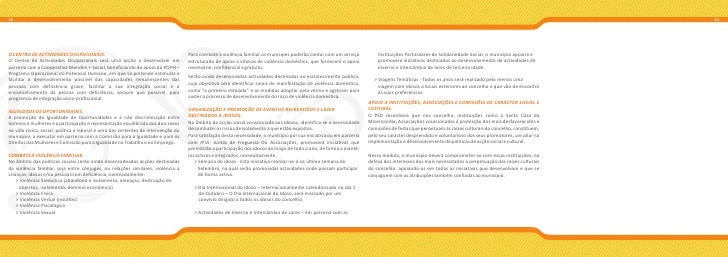 11. 11. 19 20 O CENTRO DE ACTIVIDADES OCUPACIONAIS. Para combate à violência familiar os munícipes poderão contar com um serviço Instituições Particulares de Solidariedade Social, o município apoiará e O Centro de Actividades Ocupacionais será uma acção a desenvolver em estruturado de apoio a vítimas de violência doméstica, que fornecerá o apoio promoverá iniciativas destinadas ao desenvolvimento de actividades de parceria com a Cooperativa Mondim + Social, beneficiando do apoio do POPH – necessário, confidencial e gratuito. inverno e intercâmbio de lares de terceira idade. Programa Operacional do Potencial Humano, em que se pretende estimular e Serão ainda desenvolvidas actividades destinadas ao esclarecimento público, facilitar o desenvolvimento possível das capacidades remanescentes das > Viagens Temáticas - Todos os anos será realizado pelo menos uma pessoas com deficiência grave; facilitar a sua integração social e o cujo objectivo será identificar sinais de manifestação de violência doméstica, viagem com idosos a locais exteriores ao concelho e que vão de encontro encaminhamento da pessoa com deficiência, sempre que possível, para como “a primeira estalada” e as medidas adoptar pela vitima e agressor para às suas preferências. programas de integração sócio-profissional. suster o processo de desenvolvimento do risco de violência domestica. APOIO A INSTITUIÇÕES, ASSOCIAÇÕES E COMISSÕES DE CARÁCTER SOCIAL E IGUALDADE DE OPORTUNIDADES. ORGANIZAÇÃO E PROMOÇÃO DE EVENTOS RECREATIVOS E LAZER CULTURAL. A promoção da Igualdade de Oportunidades e a não discriminação entre DESTINADOS A IDOSOS. O PSD reconhece que nos concelho, instituições como a Santa Casa da homens e mulheres e a participação e representação equilibrada dos dois sexos No âmbito da acção social vocacionada aos idosos, identifica-se a necessidade Misericórdia; Associações vocacionadas à protecção dos mais desfavorecidos e na vida cívica, social, política e laboral é uma das vertentes de intervenção do de combater os riscos de isolamento a que estão expostos. comissões de festas que perpetuam as raízes culturais do concelho, constituem, município, a executar em parceria com a Comissão para a Igualdade e para os Para satisfação desta necessidade, o município por sua iniciativa ou em parceria pelo seu carácter desprendido e voluntarioso dos seus promotores, um pilar na Direitos das Mulheres e Comissão para a Igualdade no Trabalho e no Emprego. com IPSS; Juntas de Freguesia Ou Associações, promoverá iniciativas que implementação e desenvolvimento de políticas de acção social e cultural. permitirão a participação dos idosos ao longo de todo o ano, de forma a mantê- COMBATE À VIOLÊNCIA FAMILIAR. los activos e integrados, nomeadamente: Nessa medida, o município deverá comprometer-se com essas instituições, na No âmbito das politicas sociais serão ainda desencadeadas acções destinadas > Semana do idoso - Esta iniciativa realizar-se-á na última semana do defesa dos interesses dos mais necessitados e perpetuação das raízes culturais da violência familiar, seja entre cônjuges, ou relações similares, violência a Setembro, na qual serão promovidas actividades onde possam participar do concelho, apoiando-as em todas as iniciativas que desenvolvam e que se crianças, idosos e/ou pessoas com deficiência, nomeadamente: de forma activa. conjuguem com as atribuições também confiadas ao município. > Violência Simbólica (abandono e isolamento, ameaças, destruição de objectos, isolamento, domínio económico) > Dia Internacional do Idoso – Internacionalmente calendarizado no dia 1 > Violência Física de Outubro – O Dia Internacional do Idoso, será marcado por um > Violência Verbal (insultos) convívio dirigido a todos os idosos do concelho. > Violência Psicológica > Violência Sexual > Actividades de Inverno e Intercâmbio de Lares – Em parceria com as