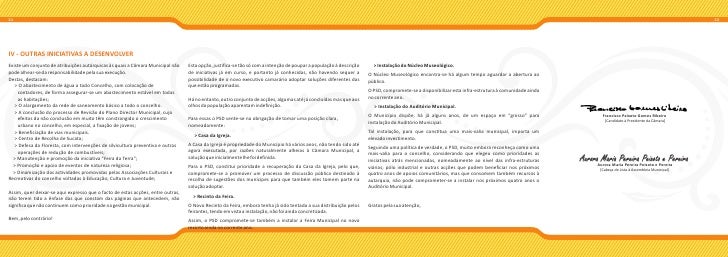 12. 12. 21 22 IV - OUTRAS INICIATIVAS A DESENVOLVER Existe um conjunto de atribuições autárquicas às quais a Câmara Municipal não Esta opção, justifica-se tão só com a intenção de poupar a população à descrição > Instalação do Núcleo Museológico. pode alhear-se da responsabilidade pela sua execução. de iniciativas já em curso, e portanto já conhecidas, não havendo sequer a O Núcleo Museológico encontra-se há algum tempo aguardar a abertura ao Destas, destacam: possibilidade de o novo executivo camarário adoptar soluções diferentes das público. > O abastecimento de água a todo Concelho, com colocação de que estão programadas. contadores, de forma assegurar-se um abastecimento estável em todas O PSD, compromete-se a disponibilizar esta infra-estrutura à comunidade ainda as habitações; Há no entanto, outro conjunto de acções, algumas até já concluídas mas que aos no corrente ano. > O alargamento da rede de saneamento básico a todo o concelho. olhos da população aparentam indefinição. > Instalação do Auditório Municipal. > A conclusão do processo de Revisão do Plano Director Municipal, cujo O Município dispõe, há já alguns anos, de um espaço em “grosso” para Francisco Peixoto Gomes Ribeiro efeitos da não conclusão em muito têm constrangido o crescimento Para essas o PSD sente-se na obrigação de tomar uma posição clara, [Candidato à Presidente da Câmara] instalação do Auditório Municipal. urbano no concelho, em especial, a fixação de jovens; nomeadamente: > Beneficiação de vias municipais. Tal instalação, para que constitua uma mais-valia municipal, importa um > Casa da Igreja. > Centro de Recolha de Sucata; elevado investimento. > Defesa da Floresta, com intervenções de silvicultura preventiva e outras A Casa da Igreja é propriedade do Município há vários anos, não tendo sido até Seguindo uma política de verdade, o PSD, muito embora reconheça como uma operações de redução de combustíveis; agora executada, por razões naturalmente alheias à Câmara Municipal, a mais-valia para o concelho, considerando que elegeu como prioridades as > Manutenção e promoção da iniciativa “Feira da Terra”; solução que inicialmente lhe foi definida. iniciativas atrás mencionadas, nomeadamente ao nível das infra-estruturas AuroraAurora Maria Pereira Peixoto e Pereira Maria Pereira Peixoto e Pereira > Promoção e apoio de eventos de natureza religiosa; Para o PSD, constitui prioridade a recuperação da Casa da Igreja, pelo que, viárias; pólo industrial e outras acções que podem beneficiar nos próximos [Cabeça de Lista à Assembleia Municipal] > Dinamização das actividades promovidas pelas Associações Culturais e compromete-se a promover um processo de discussão pública destinado à quatro anos de apoios comunitários, mas que consomem também recursos à Recreativas do concelho voltadas à Educação; Cultura e Juventude; recolha de sugestões dos munícipes para que também eles tomem parte na autarquia, não pode comprometer-se a instalar nos próximos quatro anos o solução adoptar. Auditório Municipal. Assim, quer deixar-se aqui expresso que o facto de estas acções, entre outras, não terem tido a ênfase das que constam das páginas que antecedem, não > Recinto da Feira. significa que não continuem como prioridade na gestão municipal. O Novo Recinto da Feira, embora tenha já sido tentada a sua distribuição pelos Gratos pela sua atenção, feirantes, tendo em vista a instalação, não foi ainda concretizada. Bem, pelo contrário! Assim, o PSD compromete-se também a instalar a Feira Municipal no novo recinto ainda no corrente ano.