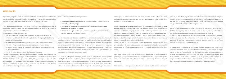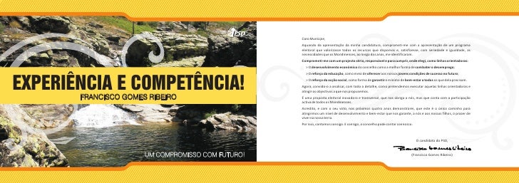 2. 2. Caro Munícipe, Aquando da apresentação da minha candidatura, comprometi-me com a apresentação de um programa eleitoral que valorizasse todos os recursos que dispomos e, satisfizesse, com seriedade e igualdade, as necessidades que os Mondinenses, ao longo dos anos, me identificaram. Comprometi-me com um projecto sério, responsável e para cumprir, onde elegi, como linhas orientadoras: > O desenvolvimento económico do concelho como a melhor forma de combater o desemprego; > O reforço da educação, como meio de oferecer aos nossos jovens condições de sucesso no futuro; EXPERIÊNCIA E COMPETÊNCIA! > O reforço da acção social, como forma de garantir o mínimo de bem-estar a todos os que dela precisam. Agora, convido-o a analisar, com todo o detalhe, como pretendemos executar aquelas linhas orientadoras e atingir os objectivos a que nos propusemos. FRANCISCO GOMES RIBEIRO É uma proposta eleitoral inovadora e transversal, que nos obriga a nós, mas que conta com a participação activa de todos os Mondinenses. Acredito, e com o seu voto, nos próximos quatro anos demonstrarei, que este é o único caminho para atingirmos um nível de desenvolvimento e bem-estar que nos garante, a nós e aos nossos filhos, o prazer de viver na nossa terra. Por isso, contamos consigo. E consigo, o concelho pode contar connosco. O candidato do PSD, UM COMPROMISSO COM FUTURO! (Francisco Gomes Ribeiro)