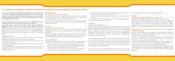 8. 8. 13 14 II - O REFORÇO DA EDUCAÇÃO, COMO MEIO DE OFERECER AOS NOSSOS JOVENS CONDIÇÕES DE SUCESSO NO FUTURO. Ao nível da educação, a Câmara Municipal dispõe já de várias iniciativas, que DESPORTO E LAZER > Sensibilizar as crianças para o tempo de biodegradação dos resíduos; pavilhão desportivo, entre outros serviços disponibilizados. vão desde a Biblioteca Municipal; as Actividades de Enriquecimento Construção da Piscina Municipal Aquecida. > Sensibilizar as crianças para a política dos 3 R's; Curricular; o serviço de refeições nas escolas; o transporte escolar e medidas Enquadrada no espírito da promoção desportiva e lazer como forma de defesa > Fomentar as práticas de redução, reutilização e a correcta separação dos DESPORTO de acção social escolar vertidas no escalonamento e complementadas com o dos jovens dos riscos sociais, o Município será dotado de um equipamento resíduos. Valorização do Parque de Polidesportivos nas freguesias. fornecimento de livros escolares. estrutural para a pratica desportiva em períodos de inverno. Em suporte às acções de sensibilização, será ainda instalado em cada edifício As freguesias do concelho dispõem de várias equipamentos desportivos. Construção da Piscina Municipal Aquecida é uma carência há muito escolar “O Mini-Ecoponto da minha Escola”. O município, num espírito de defesa dos jovens dos riscos sociais a que estão É certo que algumas medidas carecem de ajustes de eficiência de forma a reconhecida e que urge colmatar, pelo que, será uma realidade no concelho no expostos, como a toxicodependência e criminalidade, desenvolverá iniciativas oferecer uma resposta mais adequada aos alunos que as utilizam. quadriénio 2009/2013. JUVENTUDE que constituam por um lado uma forma saudável de ocupação dos tempos No entanto, além da execução dos citados ajustes, outras respostas se Rede de Voluntariado Municipal. livres da população mais jovem, e pelo outro, contribuam, em parceria com as impõem de forma a dotar-se os nossos jovens de condições de sucesso no EDUCAÇÃO Inserida na perspectiva de interacção e responsabilização dos jovens na freguesias, para a rentabilização das infra-estruturas desportivas que dispõem. futuro e promover a sua interacção e responsabilização na comunidade onde Instalação da Biblioteca Municipal. comunidade onde estão inseridos, defendendo-os dos riscos sociais a que estão estão inseridos, defendendo-os dos riscos sociais, como a toxicodependência e Encontrando-se em fase de conclusão as obras de construção da Biblioteca expostos, a rede de voluntariado municipal é uma iniciativa de livre adesão em MANUTENÇÃO DE INICIATIVAS JÁ INSTALADAS AO NÍVEL DA EDUCAÇÃO; abandono escolar, a que estão expostos. Para tanto, o programa de acção do Municipal de Mondim de Basto, a sua instalação é vista pelo PSD como uma que, em especial a população jovem, poderá através de uma plataforma CULTURA E DESPORTO. Partido Social Democrata propõem-se adoptar, entre outras, as seguintes prioridade. electrónica inscrever-se para contribuir, em regime de voluntariado, na Inseridas numa dinâmica social, as politicas de acção educativa, cultural e acções: Além da instalação, serão ainda desenvolvidas iniciativas que permitam organização e monitorização das acções sociais, culturais e desportivas a desporto, deverão ser definidas em diálogo permanente com os encarregados aproximá-la de todos os munícipes, ainda que geograficamente mais distantes, promover pela Câmara Municipal. de educação ou seus legítimos representantes. CENTROS ESCOLARES de forma a cativá-los a introduzir a leitura como um habito do seu dia-a-dia. Só assim, se garantirá que as medidas adoptadas vão de encontro às Conclusão do processo da reorganização da rede escolar, com a criação, A participação em iniciativas da Rede de Voluntariado Municipal será valorizada necessidades criadas pelos ritmos de vida das famílias, que muitas vezes as ampliação ou beneficiação de mais um ou dois centros escolares. EDUCAÇÃO AMBIENTAL com a emissão de certificados municipais anuais, que mencionarão o tipo de condiciona no acompanhamento dos seus filhos. Previsto na Carta Educativa Escolar do concelho está em execução o novo A Câmara Municipal, em parceria, reforçará as Acções de Educação Ambiental iniciativas em que o voluntário participou e o número de horas prestadas, de É nesta perspectiva que PSD vê a acção do município, que terá sempre que se Centro Escolar de Mondim. nos jardins-de-infância e escolas do 1ºciclo do concelho, com o objectivo de: forma a poderem ser usados como comprovativo da disponibilidade e espírito apresentar à comunidade como o principal parceiro dos pais em prol do Naquela carta, consta ainda a necessidade de o concelho dispor de mais um ou > Demonstrar todos os processos de recolha e tratamento dos resíduos; de entre ajuda e voluntariado dos seus titulares, o que hoje constitui uma mais- desenvolvimento educacional, cultural e desportivo dos seus filhos. dois centros escolares. > Demonstrar qual o caminho percorrido pelos resíduos indiferenciados valia no acesso ao mercado de trabalho. Consequentemente, as medidas atrás definidas como prioridades não É assim prioridade para o PSD, dotar o concelho de todos os equipamentos desde as nossas casas até chegarem ao aterro sanitário. comprometem as já instaladas e muito menos impedirão a adopção de outras escolares, cuja necessidade foi identificada e prevista a forma de resolução na > Demonstrar qual o caminho percorrido pelos resíduos resultantes da Além do certificado, a Câmara Municipal poderá ainda atribuir senhas para uso que os jovens ou seus encarregados de educação venham a sugerir como Carta Educativa Escolar. recolha selectiva, desde os Ecopontos até à estação de Triagem; gratuito de serviços municiais, nomeadamente