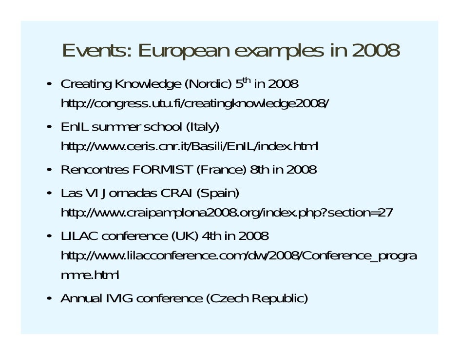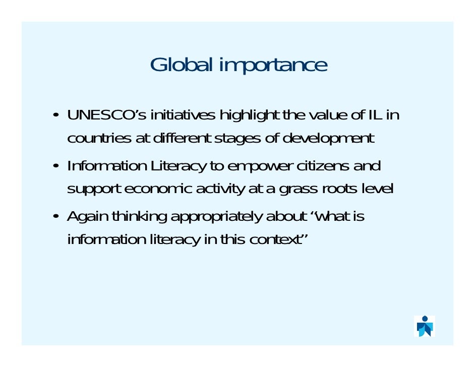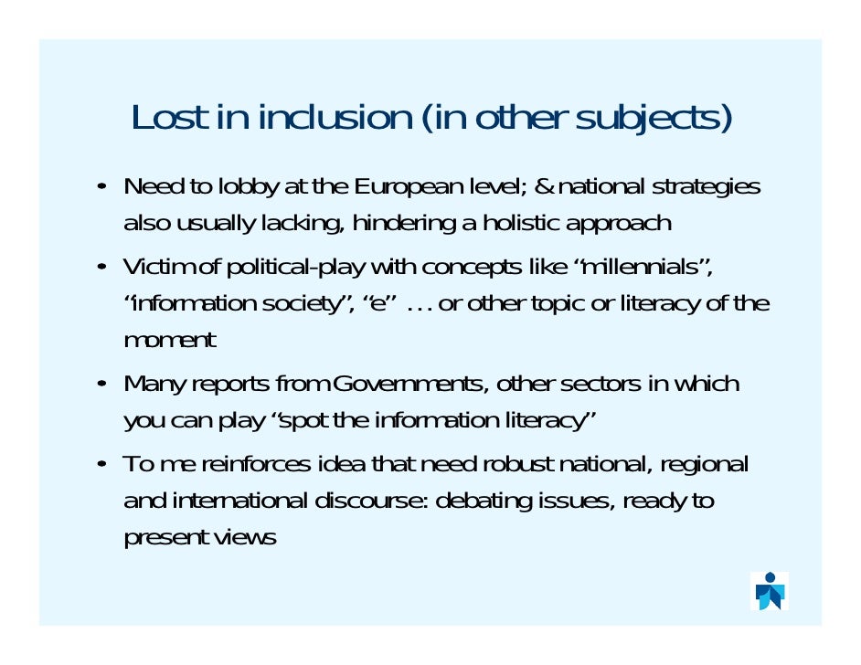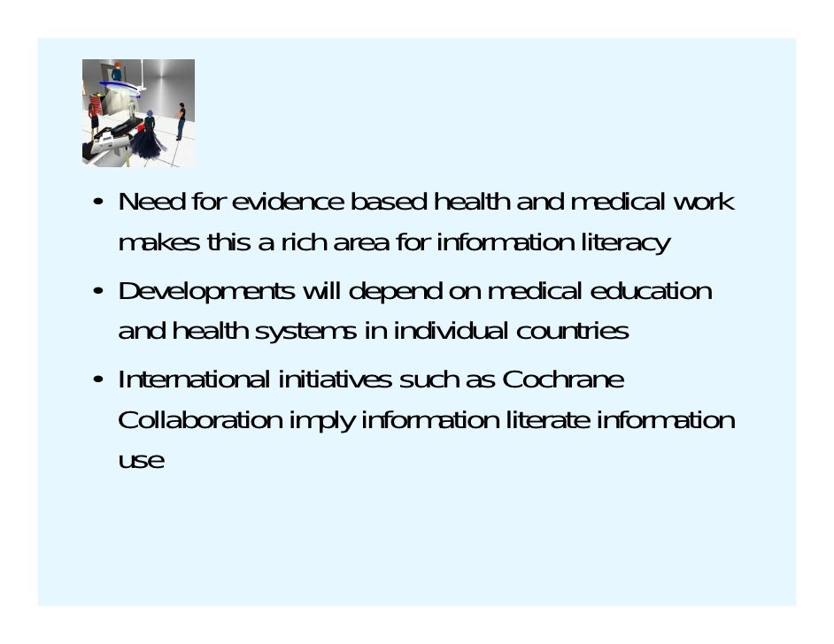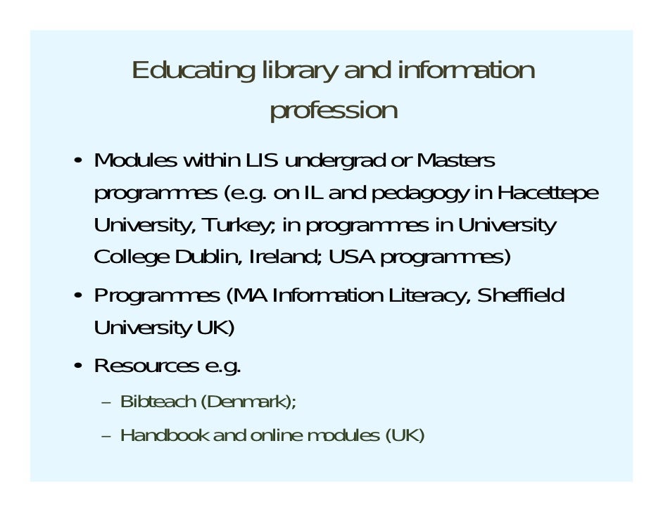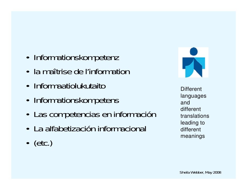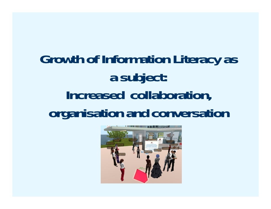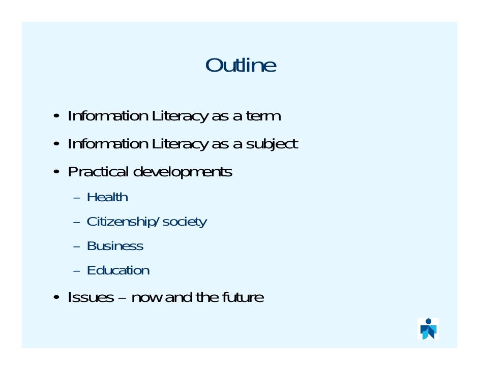This was presented at he conference, **L'education à la culture informationnelle** [Education for/in information culture], held in l’Université Charles de Gaulle Lille3, Lille, France, on 17 October 2008. In this presentation I firstly provided evidence for the development of information in key areas that can be seen as evidence for an emerging subject area or disciopline. I secondly highlighted some activities or resources in the areas of: health, business, citizenship and education. Finally, I identified some issues for debate.