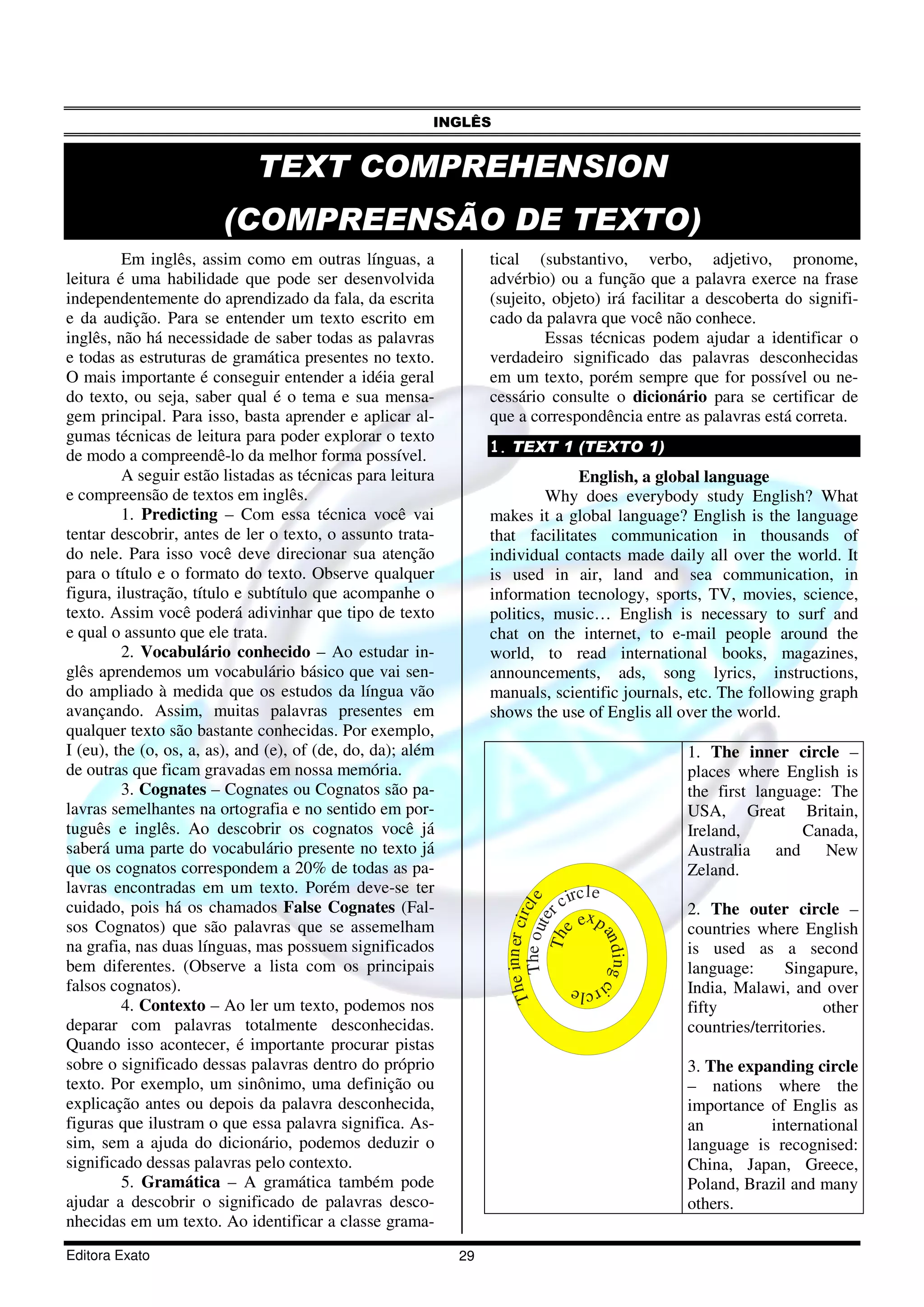 1. O documento descreve algumas técnicas para melhorar a compreensão de textos em inglês, incluindo prever o assunto com base no título, identificar palavras cognatas e usar o contexto para entender palavras desconhecidas.
