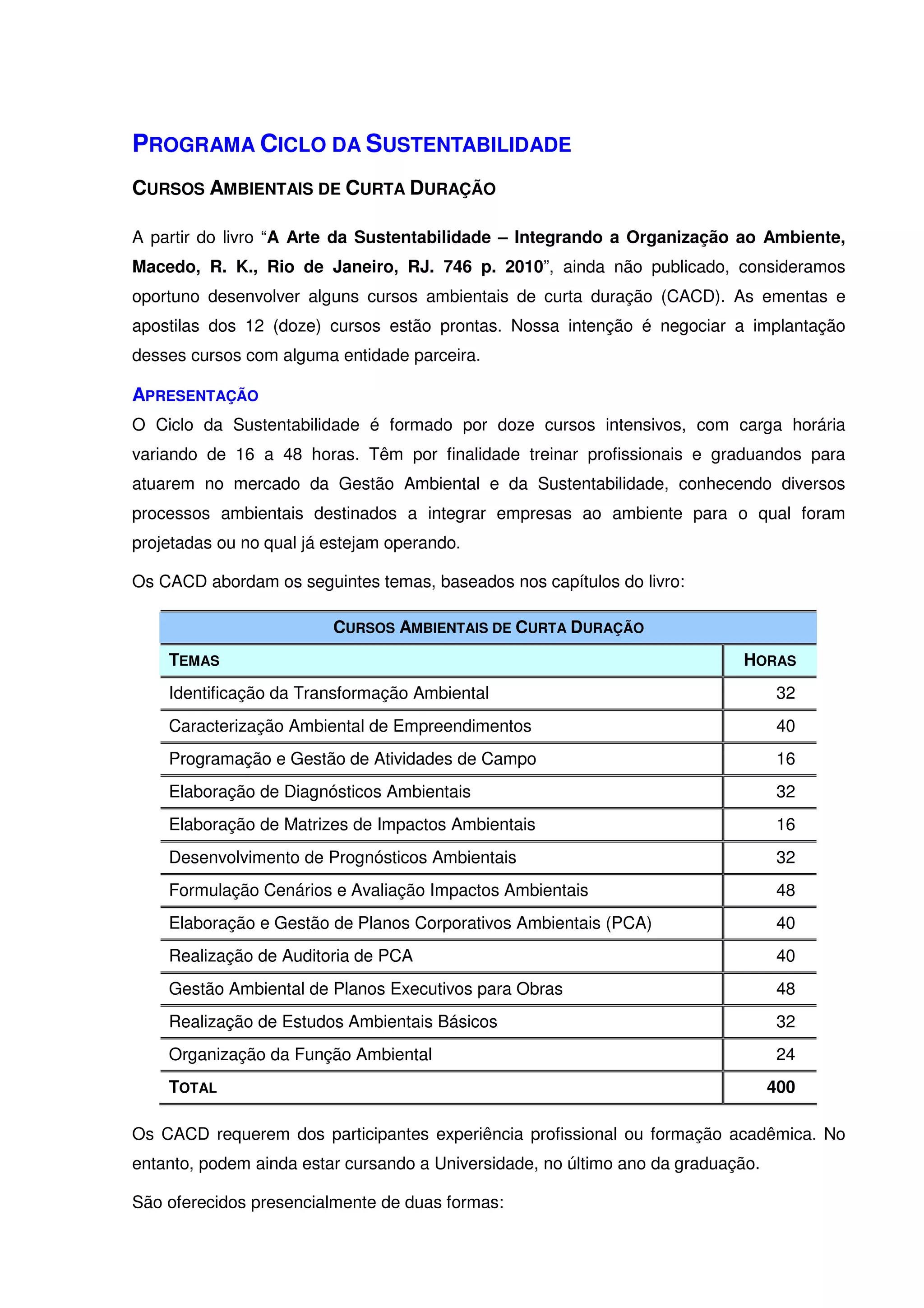 O documento descreve um programa de cursos ambientais de curta duração com 12 cursos sobre temas como identificação de transformação ambiental, caracterização ambiental de empreendimentos e elaboração de diagnósticos e planos ambientais. Os cursos variam de 16 a 48 horas e serão ministrados por especialistas para profissionais e estudantes universitários visando treiná-los em gestão ambiental e sustentabilidade.