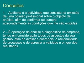 O documento discute conceitos e tipos de auditoria. Explica que a auditoria é uma análise profissional para confirmar o cumprimento de condições e avaliar a gestão de uma organização. Detalha tipos como auditoria externa, interna financeira e operacional, de gestão, informática e social.