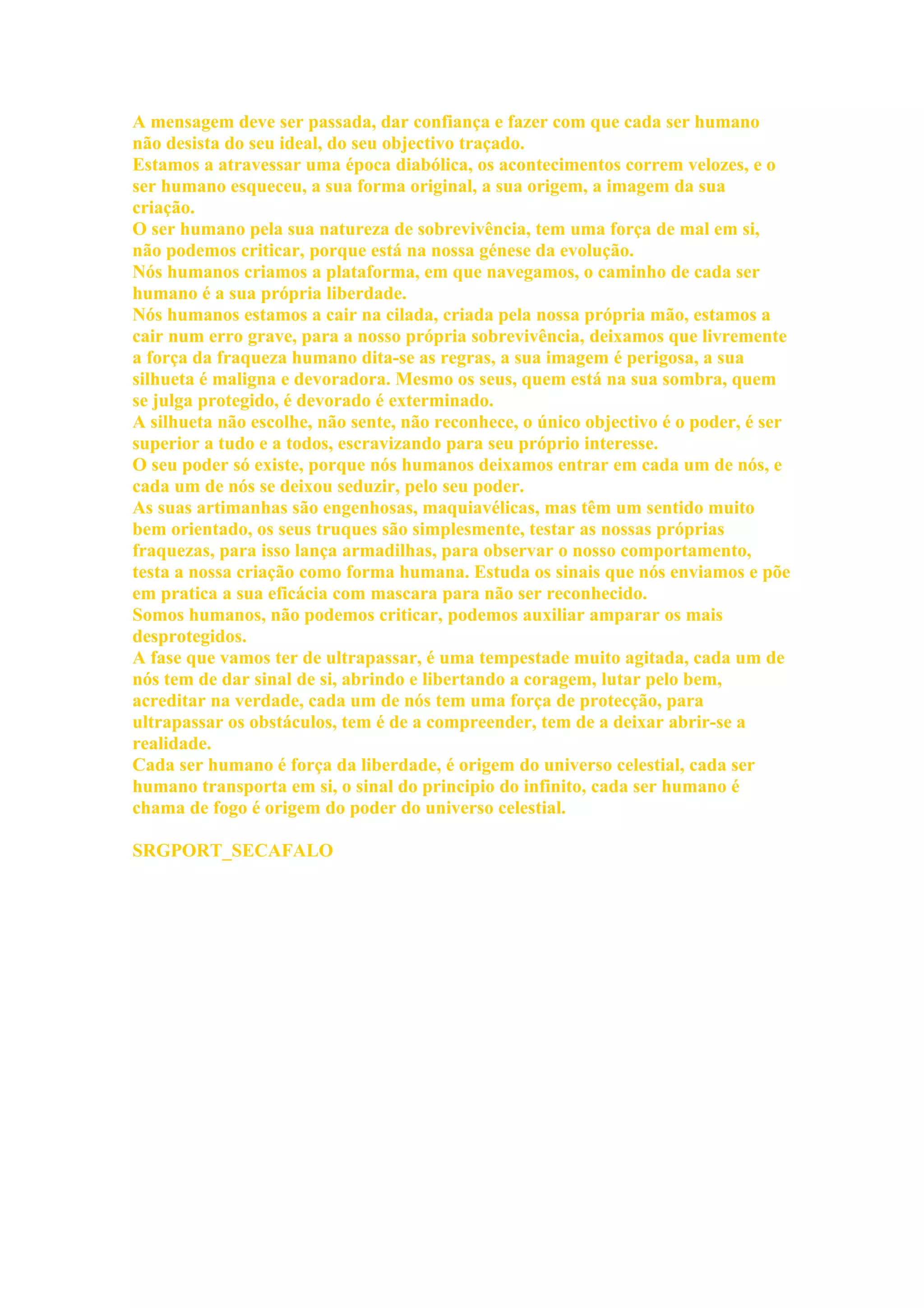 O documento discute a natureza humana e os desafios atuais. Afirma que os seres humanos estão caindo em armadilhas criadas por si mesmos ao deixar que as fraquezas humanas ditam as regras. No entanto, cada pessoa tem a força interior para superar os obstáculos se compreender e libertar sua coragem para lutar pelo bem.