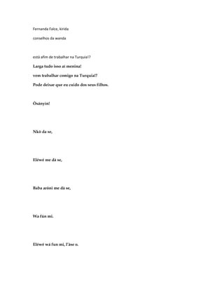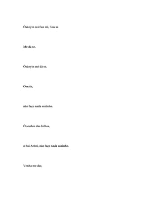 O documento apresenta informações sobre Ossaim, o orixá das folhas sagradas na religião iorubá. Em três frases, descreve que Ossaim é acompanhado pelo escravo Exu Sasanjê e pelo encantado Aroni, e apresenta algumas qualidades de Ossaim, como Ossaim Miró, Ossaim Birigã e Ossaim Atulá.