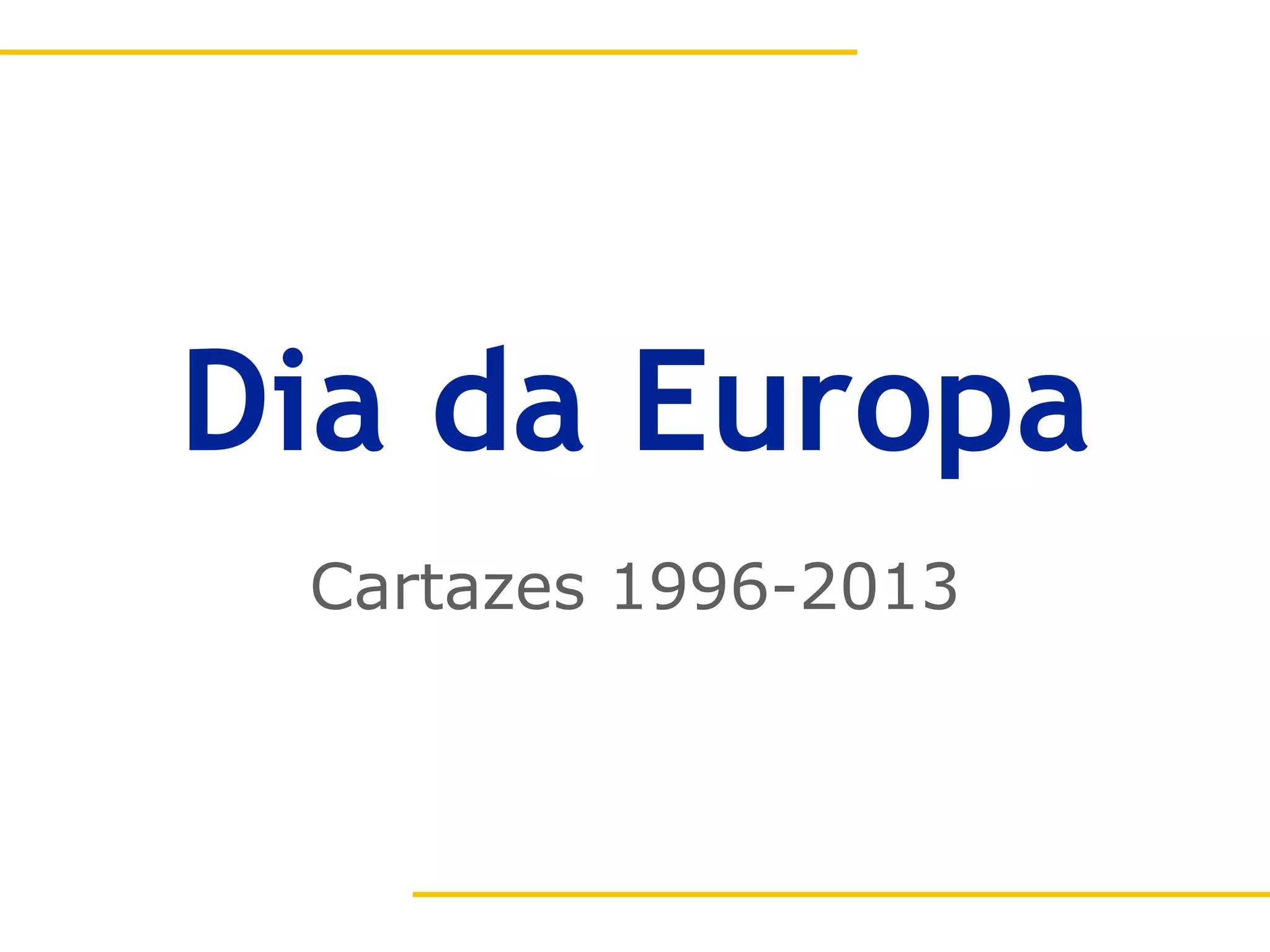 O documento apresenta uma série de cartazes produzidos entre 1996 e 2013 para comemorar o Dia da Europa, com mensagens sobre a construção da União Europeia, paz, cooperação, cidadania, solidariedade, democracia, diversidade, tolerância, progresso e desafios, diálogo intercultural e participação ativa dos cidadãos.