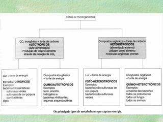 O documento discute a nutrição e o metabolismo microbiano, abordando as necessidades nutricionais das bactérias, os componentes dos meios de cultivo e as condições físicas para o seu crescimento, como temperatura, pH e atmosfera gasosa. Também apresenta exemplos de meios de cultivo químicamente definidos e para fins específicos.