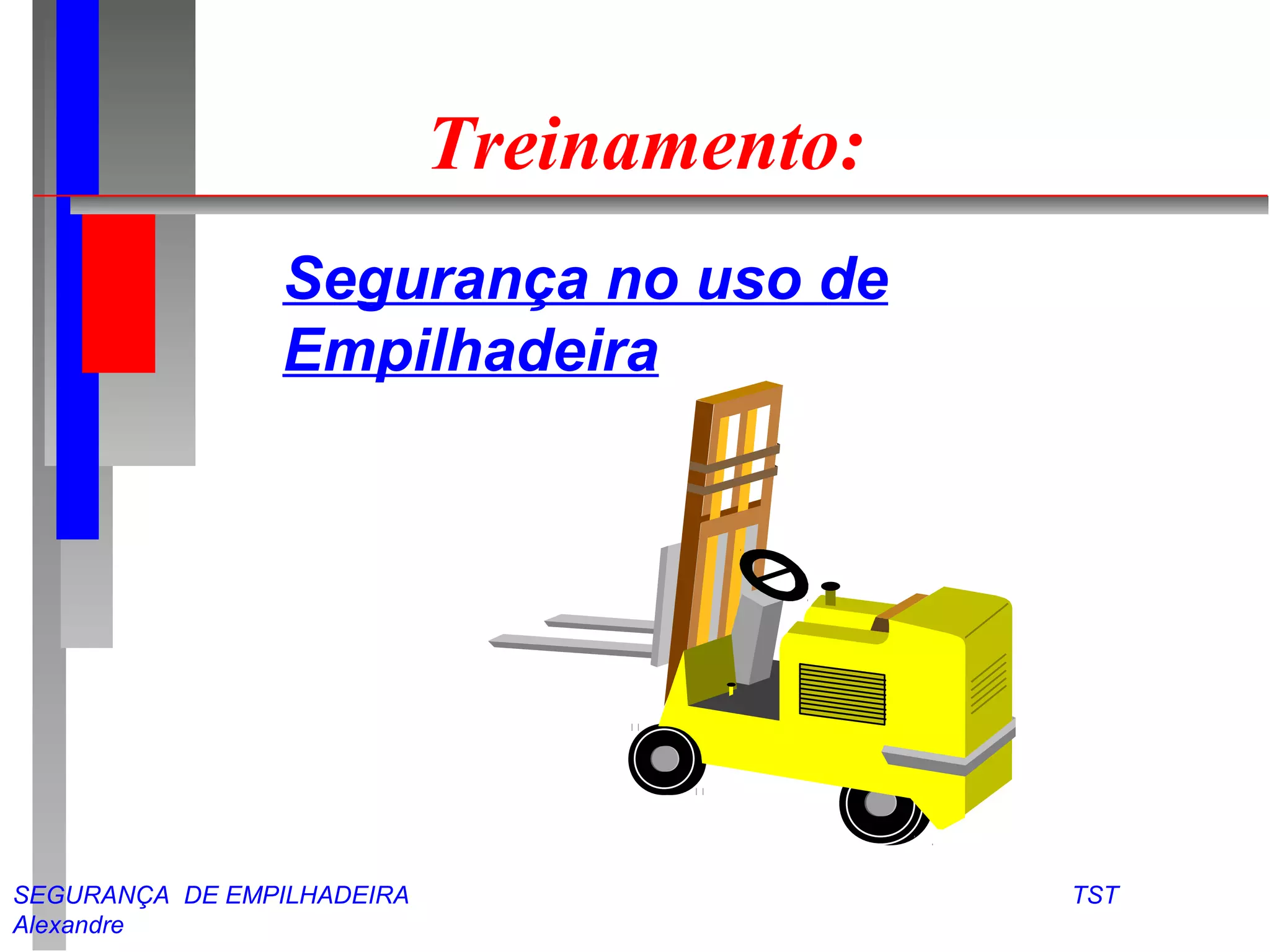 O documento fornece instruções de segurança para operadores de empilhadeiras, cobrindo tópicos como inspeção do equipamento, manuseio de cargas, trânsito, equipamentos de proteção individual e regras gerais. O treinamento tem como objetivos sensibilizar os operadores quanto aos riscos de acidentes e adoção de procedimentos seguros de acordo com normas regulatórias.