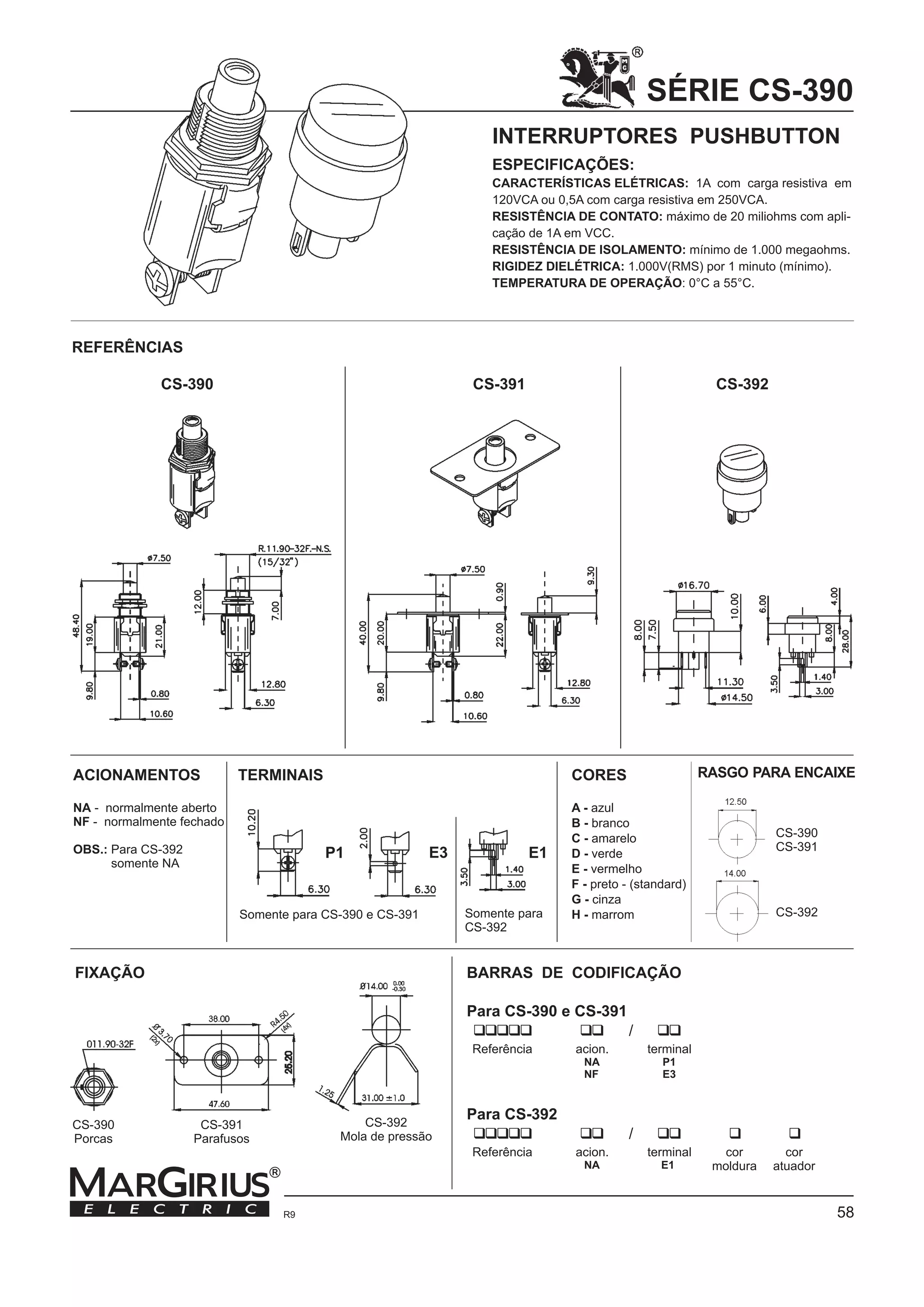 O documento descreve três modelos de interruptores pushbutton (CS-390, CS-391 e CS-392) com suas respectivas referências, acionamentos, terminais, fixação, especificações técnicas e cores disponíveis. Fornece detalhes sobre os tipos de acionamento (normalmente aberto ou fechado), terminais e métodos de fixação de cada modelo, além das especificações elétricas como resistência de contato, isolamento e rigidez dielétrica.
