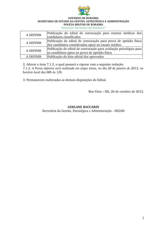 Este documento é o primeiro aditamento ao edital de concurso público para provimento de vagas de soldado da Polícia Militar de Roraima. Ele altera o cronograma do concurso, adiando algumas datas e definindo a data da prova objetiva para 20 de janeiro de 2013 das 8h às 12h. Também mantém as demais disposições do edital original inalteradas.