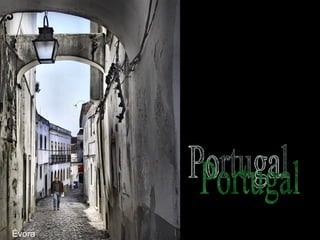 Este documento lista locais e pontos turísticos em várias regiões de Portugal, incluindo Évora, Algarve, Braga, Lisboa, Porto, Alentejo e outras. Muitos destinos populares como Lagos, Albufeira, Padrão dos Descobrimentos e Torre de Belém são mencionados, assim como locais naturais como Cabo de S. Vicente, Serra da Estrela e Ilha do Pico. O documento também fornece detalhes sobre a apresentação como o nome da pessoa que a elaborou e a música escolh