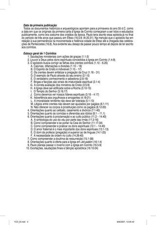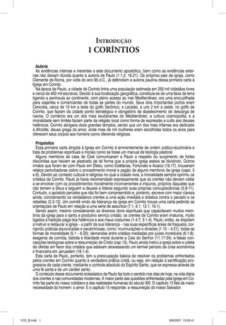 1) O documento apresenta uma introdução à primeira carta de Paulo aos Coríntios, abordando sua autoria, contexto histórico da cidade de Corinto e propósitos da carta.