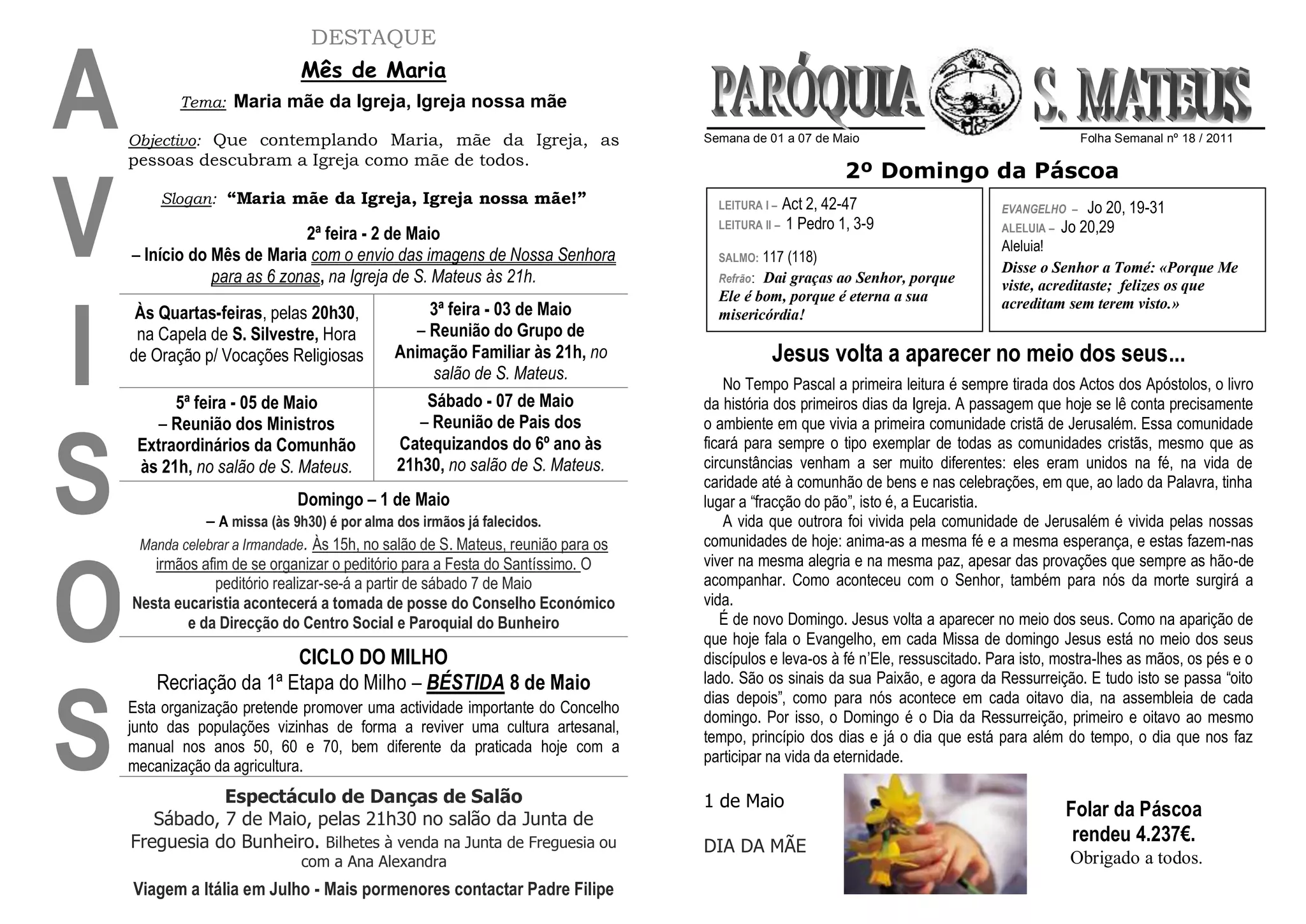 Este documento fornece informações sobre os eventos de Maio na Igreja local, incluindo o Mês de Maria, reuniões de grupos, espectáculos, e celebrações do Dia do Trabalhador e da Mãe. Também resume a leitura dominical e fornece reflexões sobre a importância da comunidade cristã.