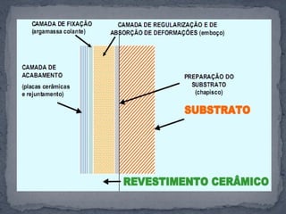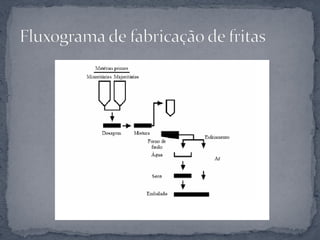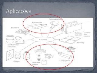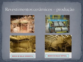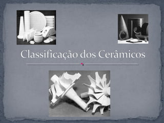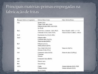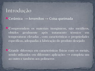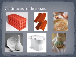 O documento descreve as propriedades e aplicações de diferentes materiais cerâmicos, incluindo argila, caulim, quartzo e outros. Detalha como esses materiais são usados na fabricação de produtos cerâmicos e suas propriedades químicas e físicas que os tornam adequados para diferentes usos industriais.