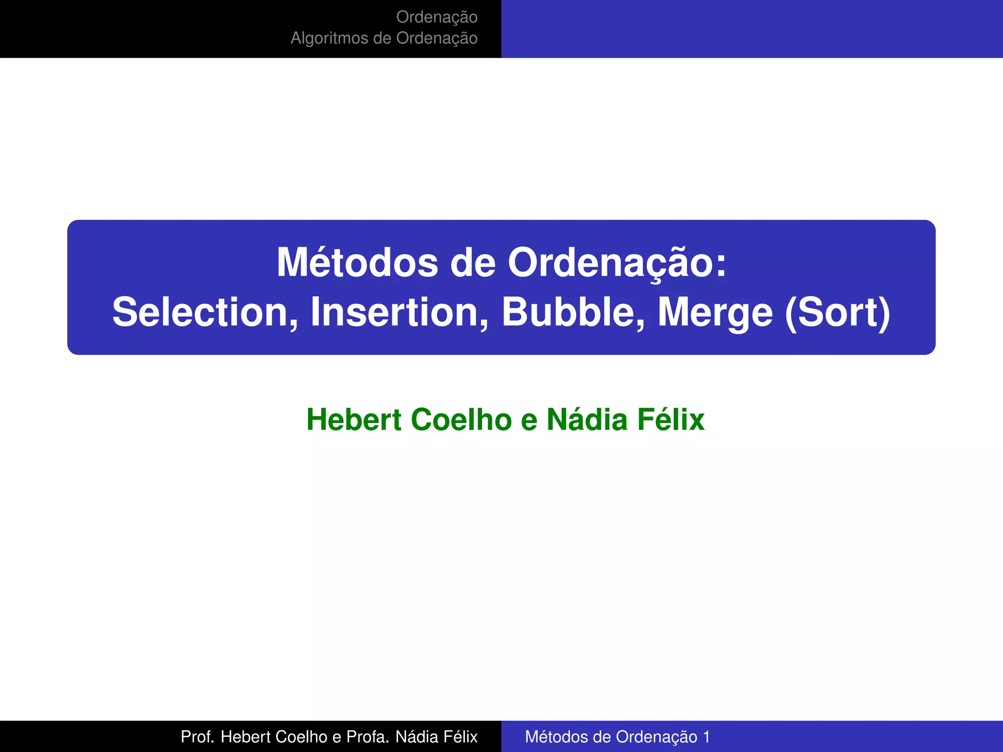 O documento discute vários algoritmos de ordenação, incluindo ordenação por inserção, ordenação por seleção e ordenação por bolhas. Descreve as ideias por trás de cada algoritmo e fornece códigos em C como exemplos. Também discute a complexidade temporal de cada algoritmo e quando cada um é mais apropriado para uso.