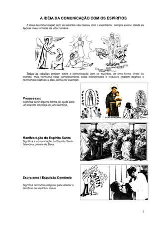 O documento discute a comunicação com espíritos de acordo com diferentes religiões e perspectivas. Ele explica que a mediunidade, ou a capacidade de se comunicar com espíritos, é inerente a todos os seres humanos, embora em diferentes graus. Também destaca a importância da educação mediúnica para o desenvolvimento saudável dessa faculdade.