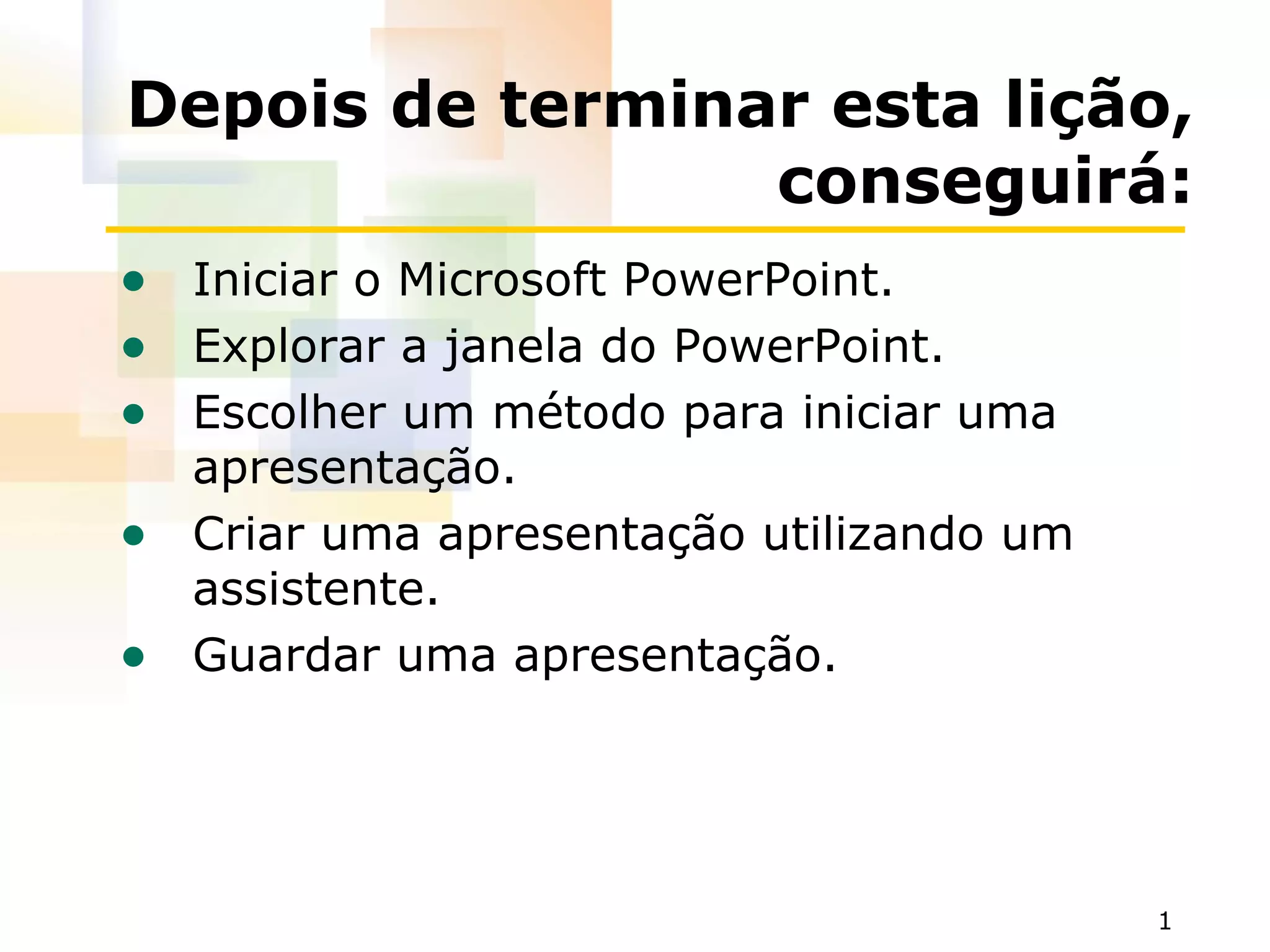 Este documento fornece instruções sobre como iniciar o Microsoft PowerPoint, explorar sua janela, criar uma apresentação usando um assistente e salvar uma apresentação. Ele explica como abrir o PowerPoint, navegar por sua interface, guiar um assistente para criar uma apresentação preenchendo campos de título, rodapé e outros, e salvar a apresentação escolhendo um nome e localização.