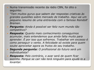 O documento resume uma entrevista fictícia com o guru Reindolf Bremen, onde ele dá respostas sábias a perguntas sobre trabalho e felicidade. Embora o entrevistado seja inventado, as respostas vêm do Livro de Eclesiastes e contêm ensinamentos sobre a vaidade da vida sem Deus e a necessidade de encontrarmos sentido olhando para o eterno.