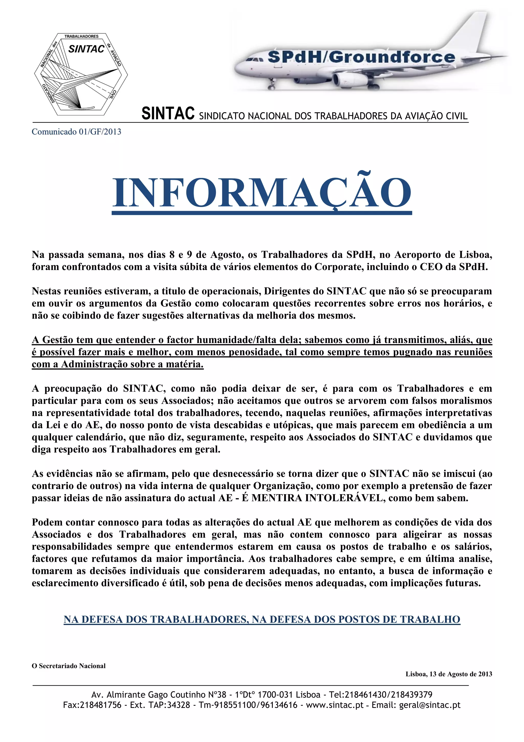 Este documento discute uma reunião entre a gestão da SPdH e dirigentes do SINTAC sobre melhorias nos horários de trabalho. O SINTAC colocou questões sobre erros nos horários e fez sugestões para melhorias. O sindicato se preocupa com os trabalhadores e não aceita falsos moralismos de outros grupos. Eles apoiam alterações que melhorem as condições dos associados, mas não irão aligeirar suas responsabilidades sobre empregos e salários.