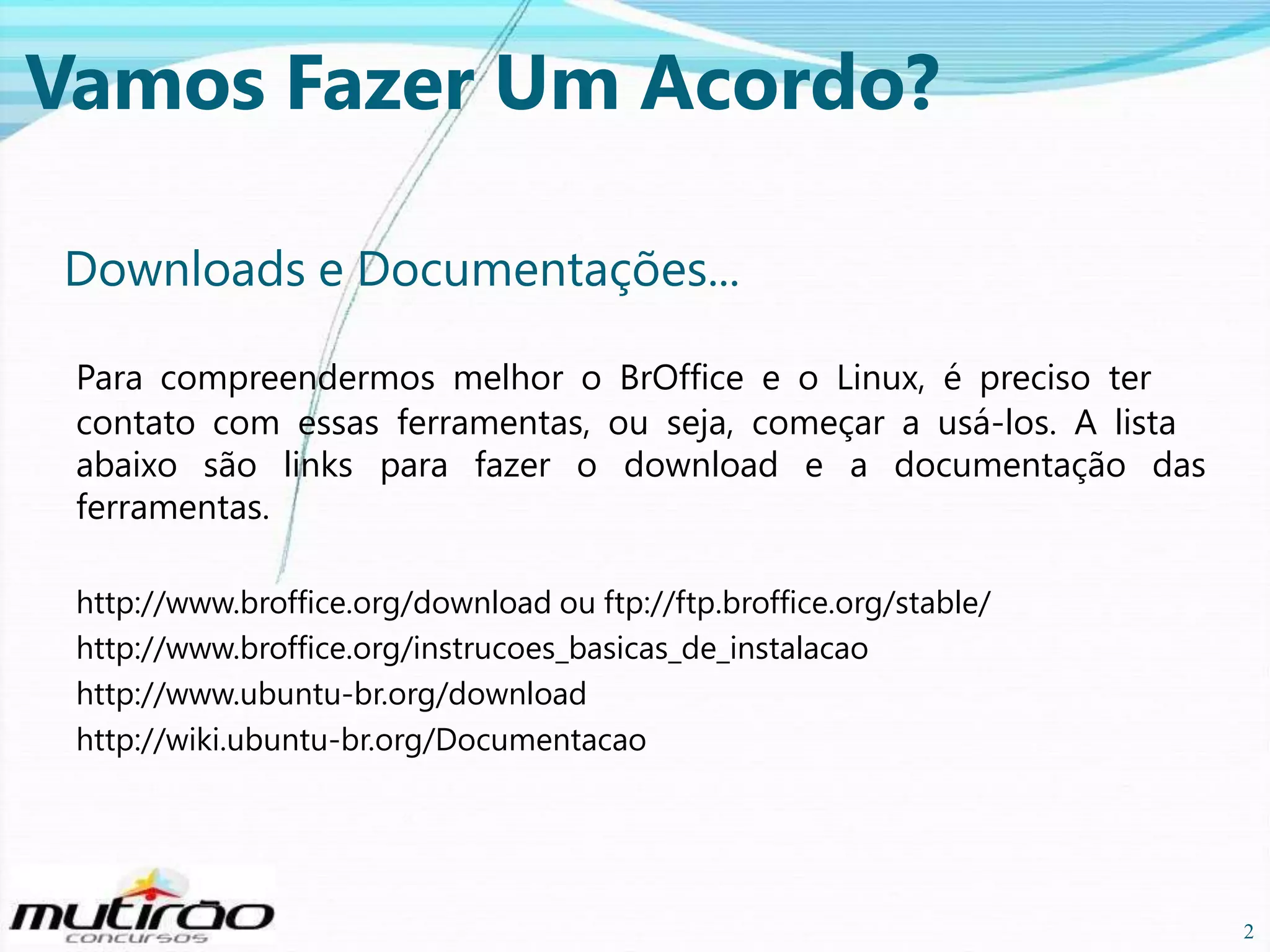 O documento fornece links para download e documentação sobre o BrOffice e Linux Ubuntu, e discute brevemente a instalação do BrOffice e a documentação do Ubuntu. Também divide os computadores em hardware (parte física) e software (parte lógica) e lista alguns componentes centrais como a placa-mãe e processador.