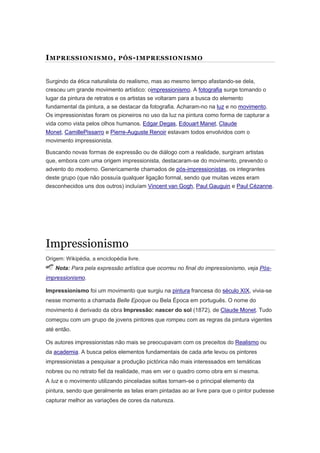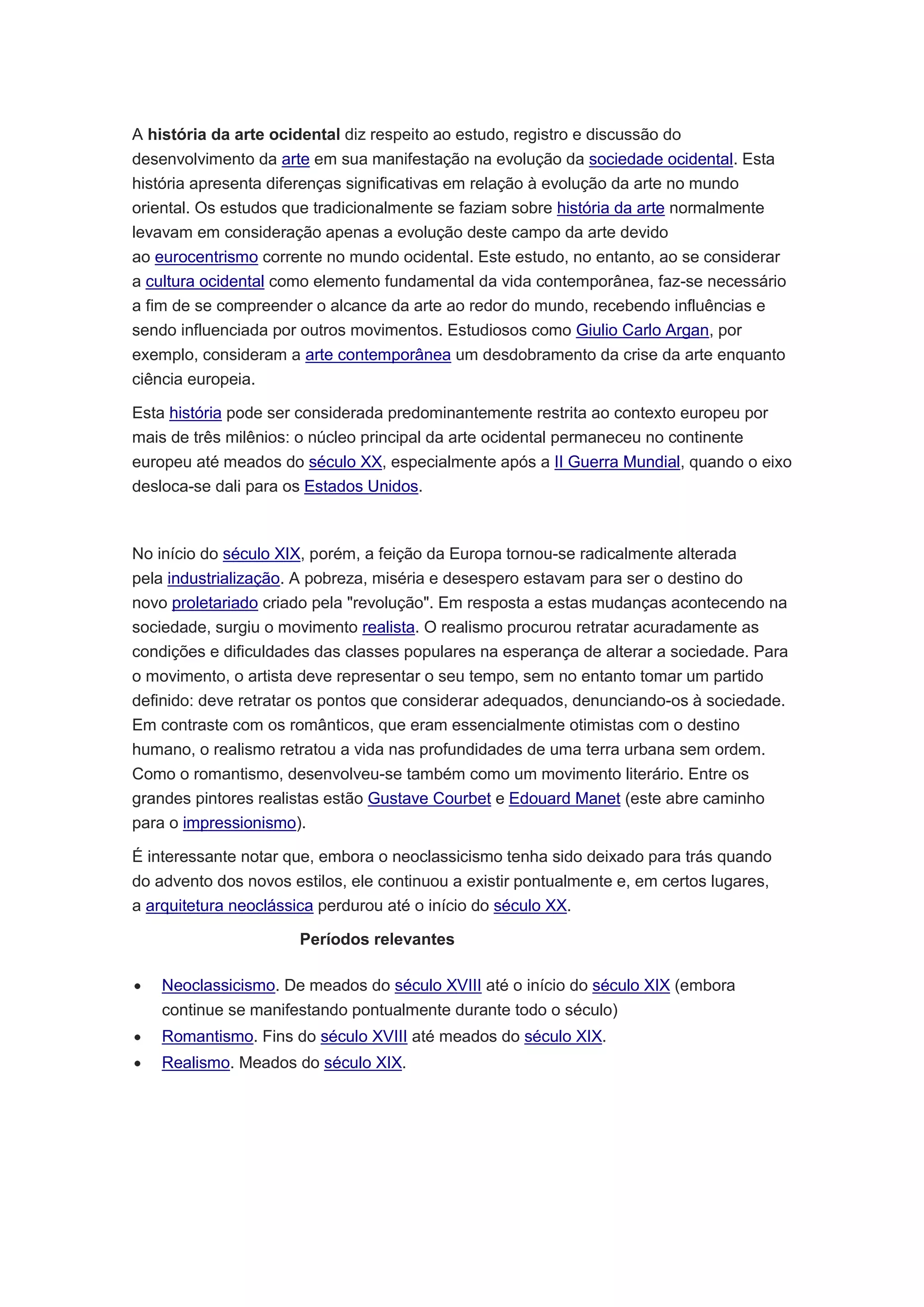 O documento discute a história da arte ocidental, seus principais períodos e movimentos artísticos como neoclassicismo, romantismo e realismo. Também aborda o surgimento do impressionismo no século XIX e seus principais expoentes, assim como o pós-impressionismo.