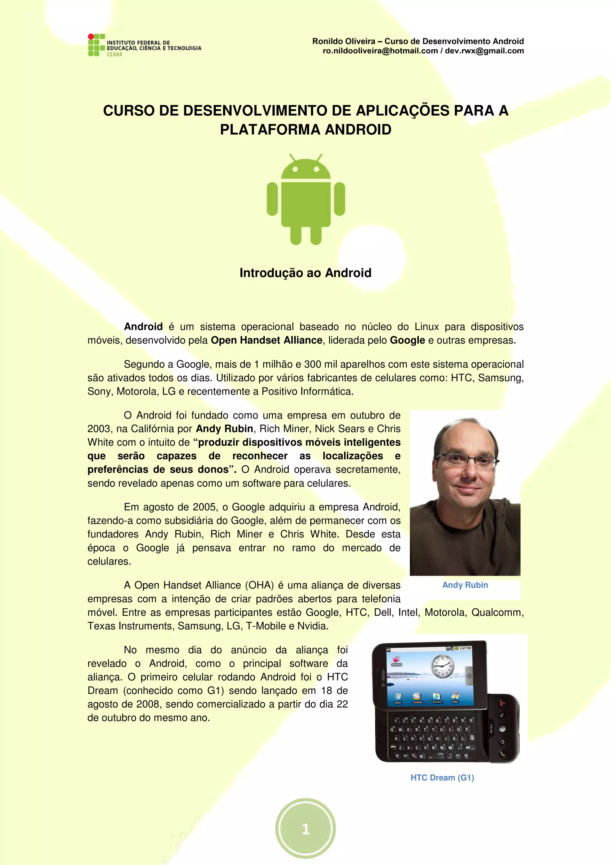 O documento descreve o sistema operacional Android, incluindo sua história, versões, arquitetura e como desenvolver aplicativos para a plataforma usando Java no Eclipse ou outros ambientes de desenvolvimento.