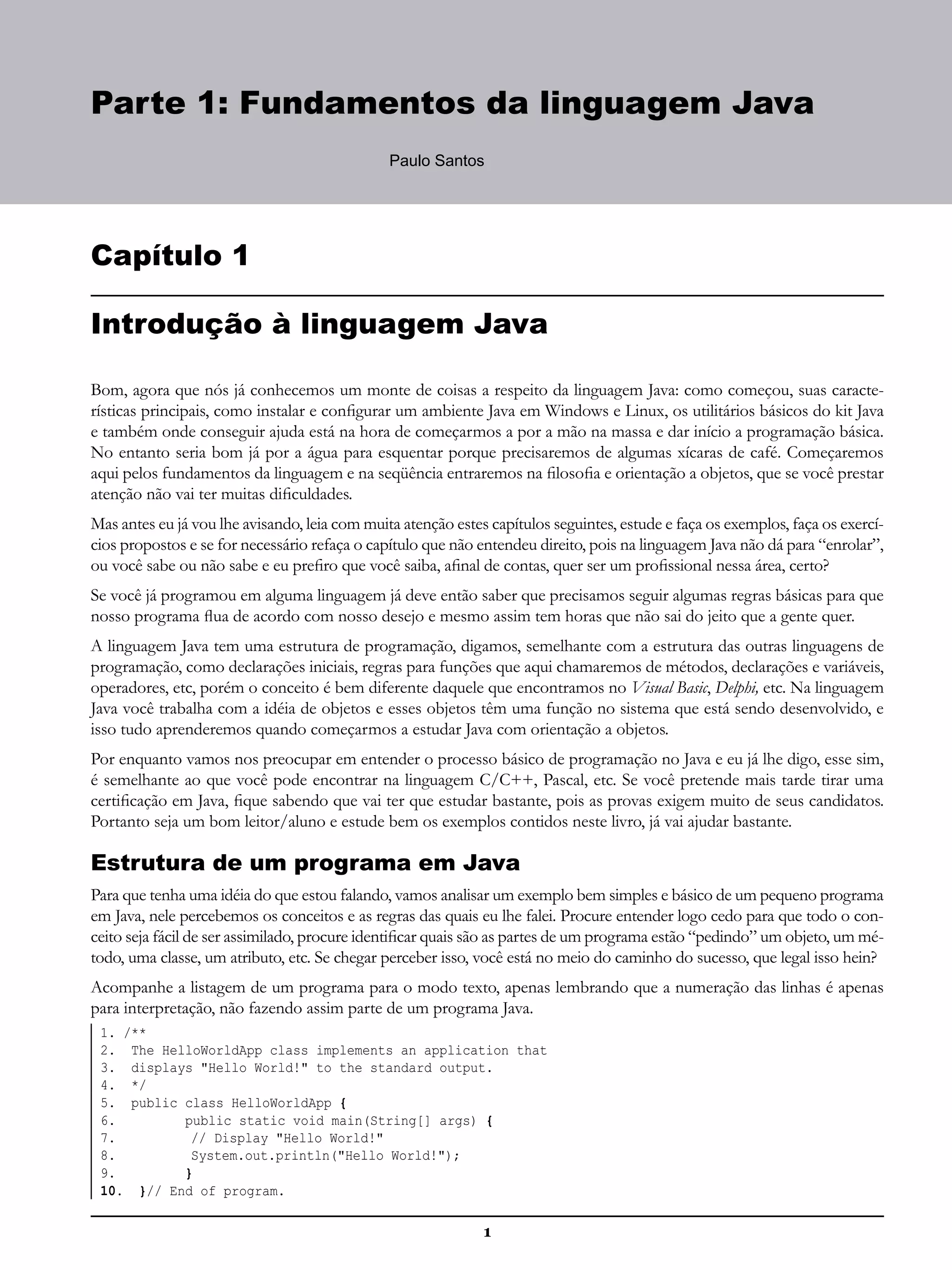 1. O documento apresenta os fundamentos básicos da linguagem Java, incluindo a estrutura de um programa simples em Java.