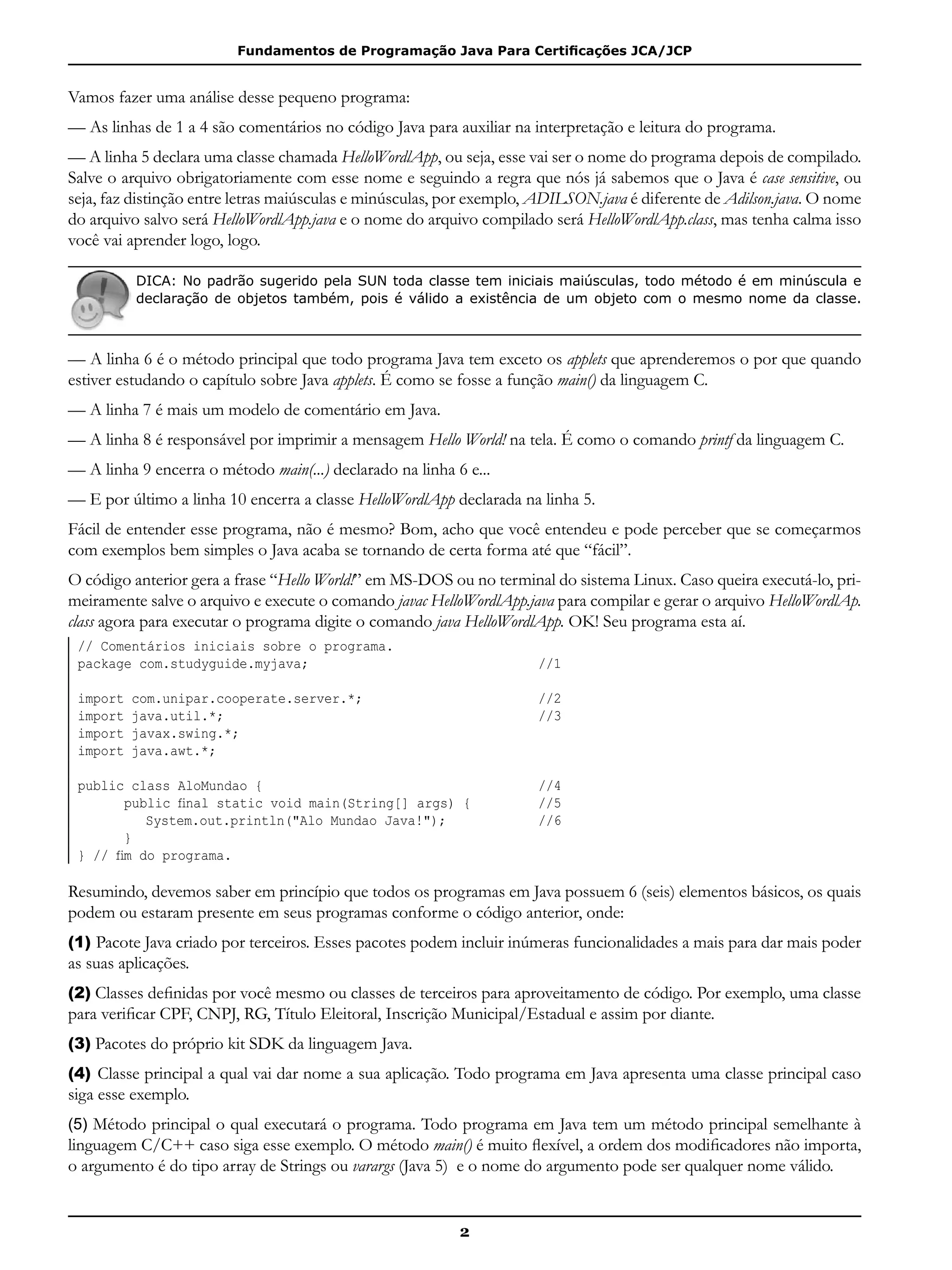 2. É explicada a estrutura de um programa Hello World básico em Java, incluindo a declaração da classe, método main, e impressão da saída.