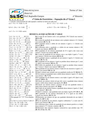 Este documento contém uma lista de exercícios de equações de 2o grau com 22 problemas para serem resolvidos. Os problemas envolvem calcular raízes de equações, encontrar números que satisfaçam certas propriedades envolvendo quadrados e outros termos algébricos. A lista fornece as etapas para resolver cada problema e a(s) solução(ões) esperada(s) entre parênteses.