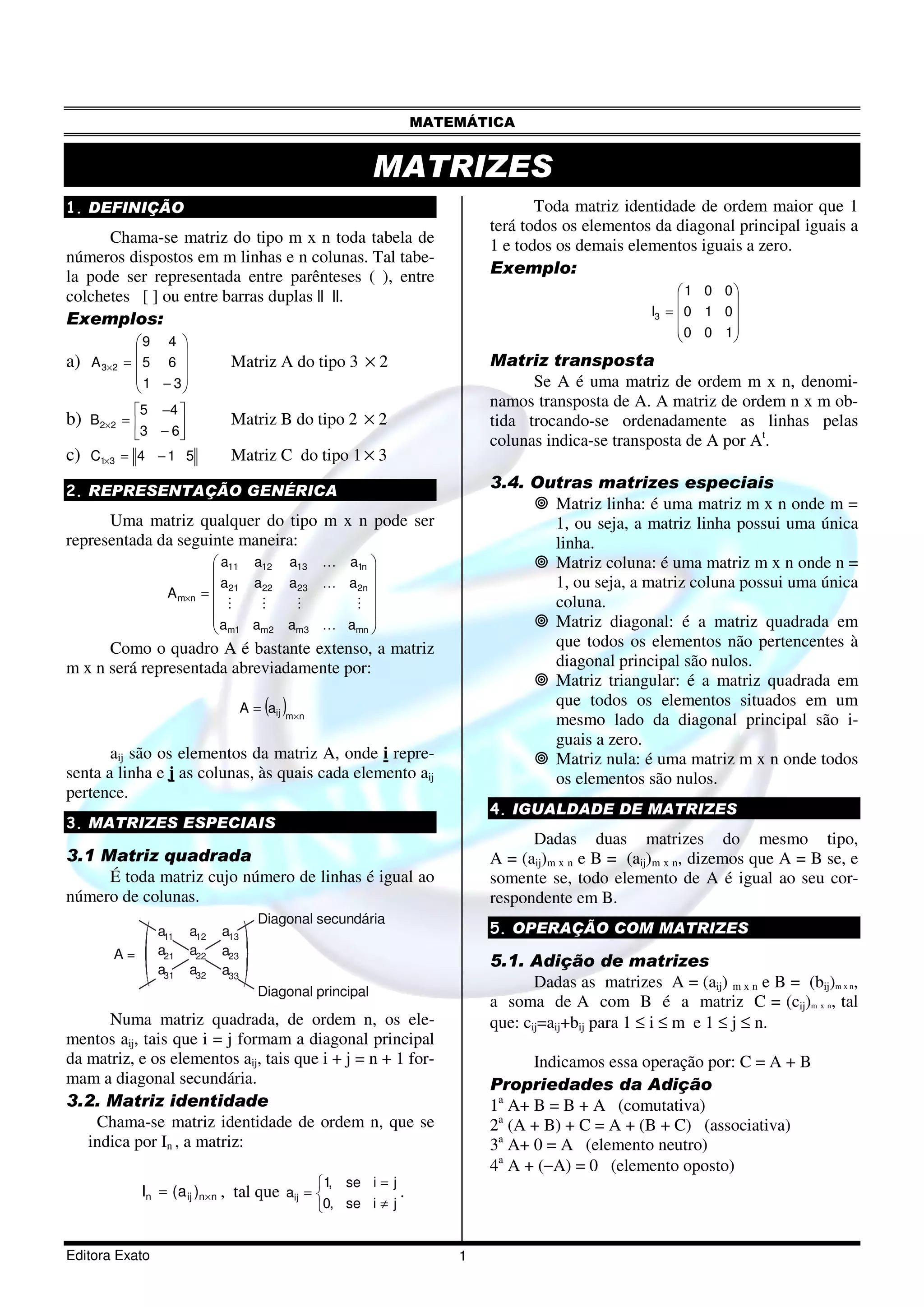 O documento apresenta os principais conceitos sobre matrizes, incluindo: 1) Definição de matriz e exemplos; 2) Representação genérica de matrizes; 3) Matrizes especiais como identidade, quadrada, triangular e nula; 4) Igualdade e operações com matrizes.