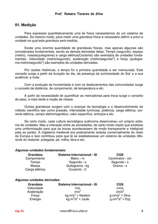 O documento apresenta notas de aula sobre física, incluindo: (1) algumas unidades fundamentais e derivadas do Sistema Internacional (SI) e CGS; (2) as divisões da física como mecânica, termodinâmica e eletromagnetismo; e (3) etapas para resolver problemas de física, como ler o problema e fazer um esquema.