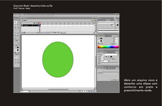 O documento fornece instruções passo-a-passo para criar um desenho de um monstro com vários elementos usando ferramentas do Flash. As instruções incluem como desenhar formas geométricas, aplicar preenchimento, transformar contornos, agrupar objetos e aplicar sombras.