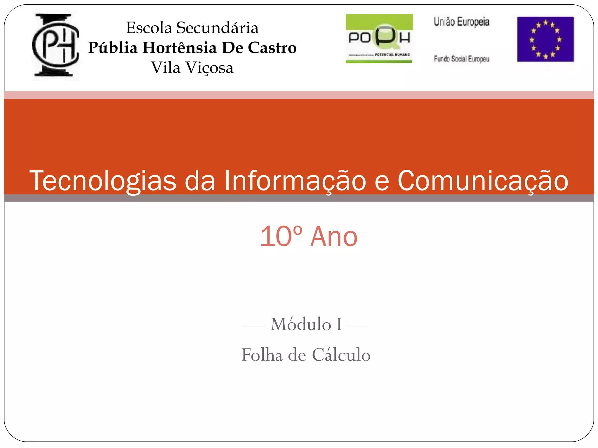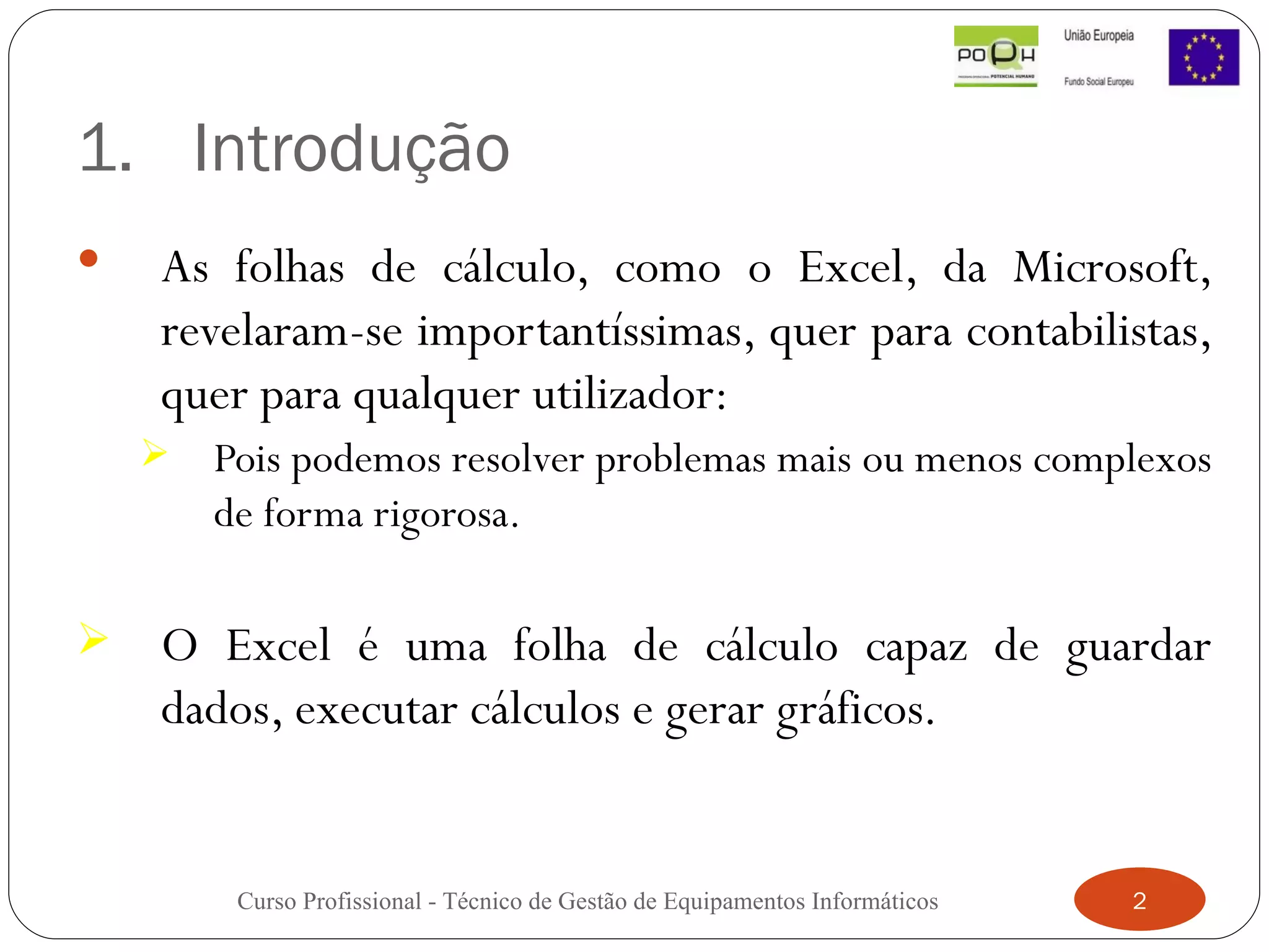 O documento descreve as funcionalidades básicas de uma folha de cálculo do Excel, incluindo proteger e ordenar dados, realizar cálculos, criar gráficos e inserir campos automáticos. Explica a estrutura de uma folha de trabalho com células organizadas em colunas e linhas, e detalha os elementos do ambiente de trabalho do Excel como a barra de título, barra de fórmulas e separadores de folhas.