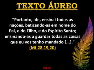 O documento discute a importância da evangelização, citando versículos bíblicos que mostram ser este o mandamento de Jesus para seus discípulos. Apresenta quatro razões para a evangelização: é um mandamento de Jesus, a maior expressão de amor da Igreja, o mundo jaz no maligno e precisa ser salvo, e Jesus em breve virá. Também descreve diferentes tipos de evangelização, como a pessoal, coletiva, nacional e transcultural, usando exemplos de Cristo.