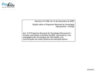 Este documento descreve um curso de formação continuada para professores sobre educação digital oferecido pelo Ministério da Educação brasileiro. O curso ensina professores a usar tecnologias como processadores de texto, apresentações, ferramentas da web para pesquisa e comunicação. Ele inclui encontros presenciais e atividades online, com avaliação baseada na participação e em um trabalho final de grupo.