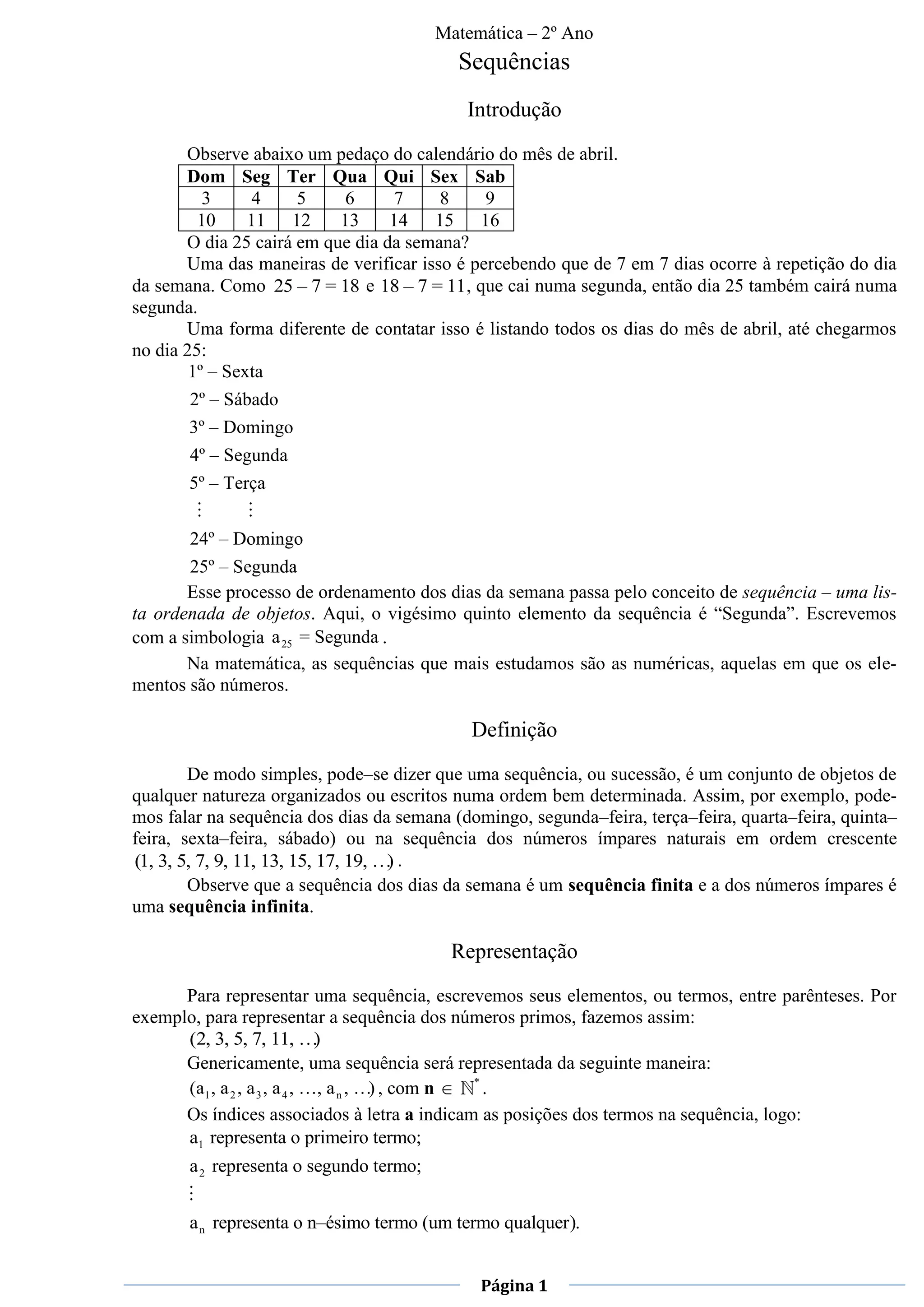 2) É introduzido o conceito de sequência como uma lista ordenada de objetos e são apresentadas definições, representações e observações sobre sequências numéricas.