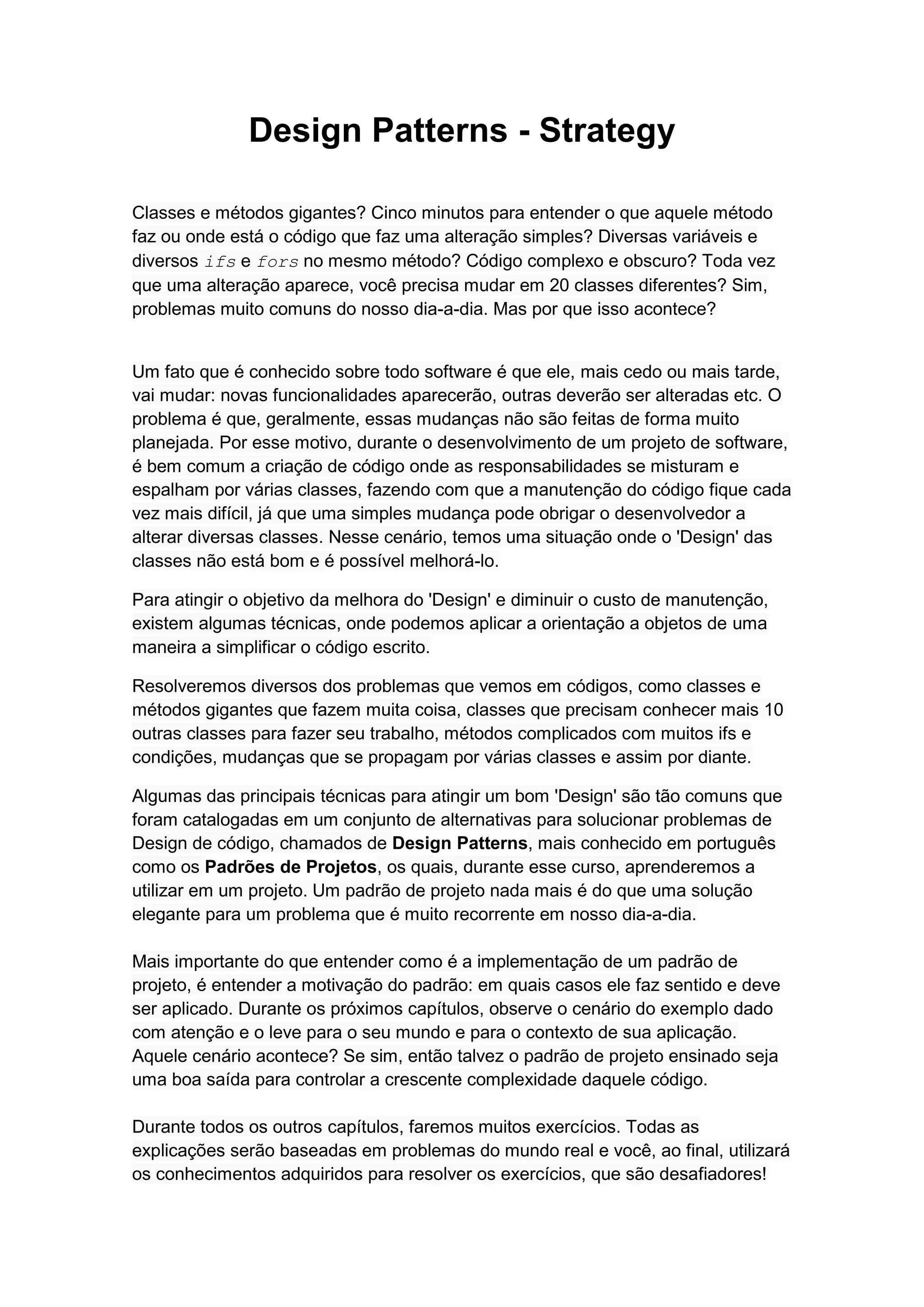 O documento discute o padrão de projeto Strategy para melhorar o design de código. Strategy encapsula comportamentos em classes separadas para que um algoritmo possa ser trocado facilmente. Isso é ilustrado com um exemplo de cálculo de impostos, onde diferentes estratégias de cálculo (classes ICMS e ISS) podem ser usadas por um calculador polimórfico.