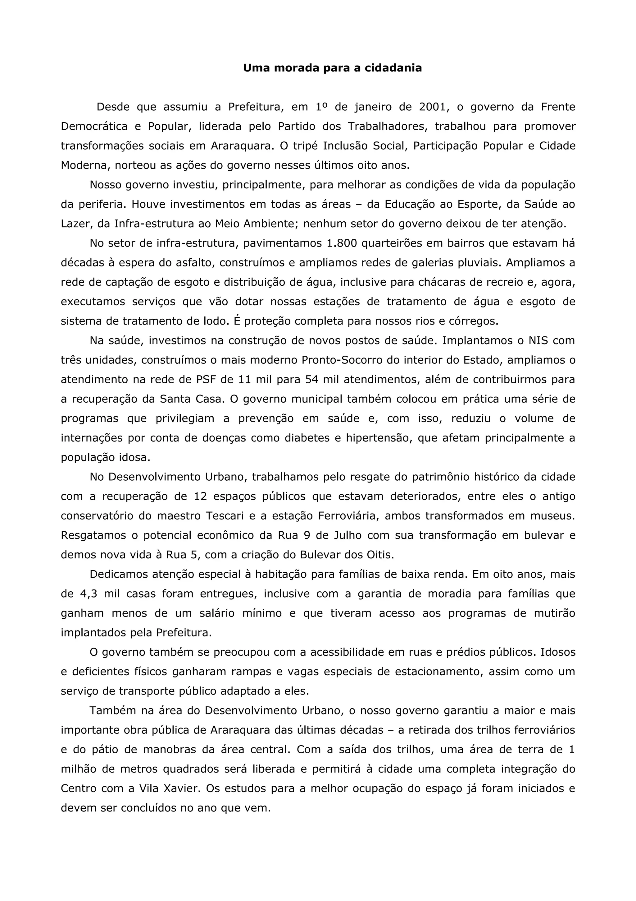 O documento resume as realizações do governo da Frente Democrática e Popular em Araraquara nos últimos oito anos, incluindo investimentos em infraestrutura, saúde, educação, cultura, inclusão social, desenvolvimento econômico e participação popular. O governo trabalhou para melhorar as condições de vida da população, especialmente da periferia, por meio de diversos programas e obras públicas.