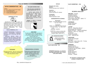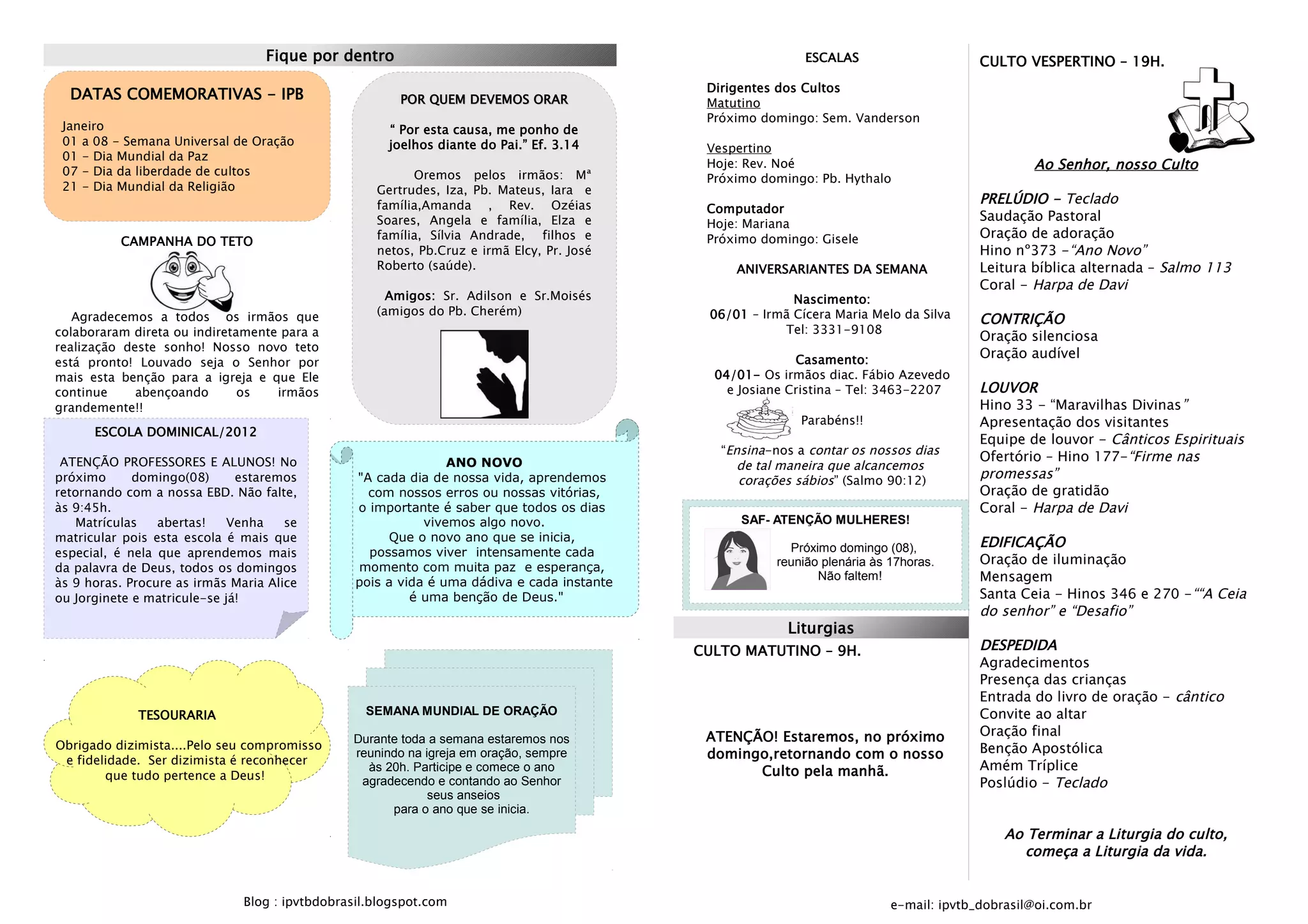 2) Anúncios sobre cultos noturnos e matutinos, dirigentes, aniversariantes e campanha para arrecadação de fundos para uma nova cobertura da igreja.