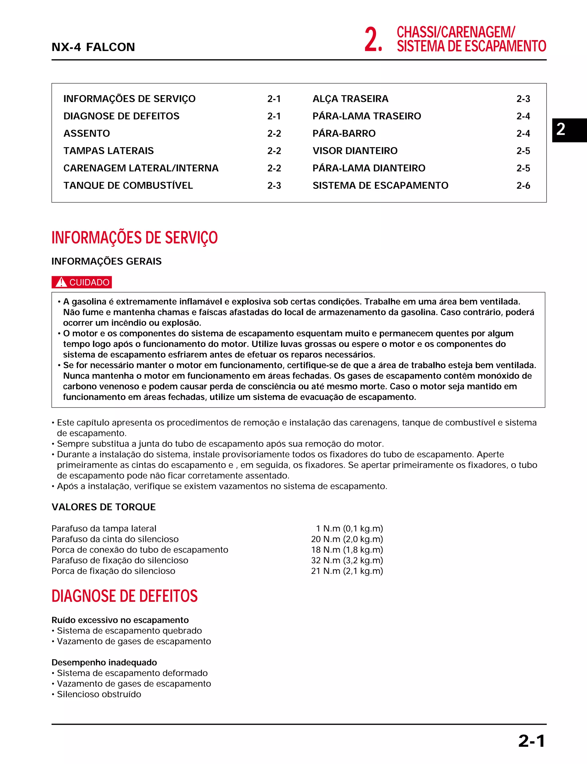 O documento fornece instruções sobre a remoção e instalação de componentes do chassi, carenagem e sistema de escapamento da motocicleta NX-4 Falcon. Inclui informações sobre valores de torque, diagnóstico de defeitos e cuidados de segurança ao trabalhar com o sistema de escapamento e tanque de combustível.