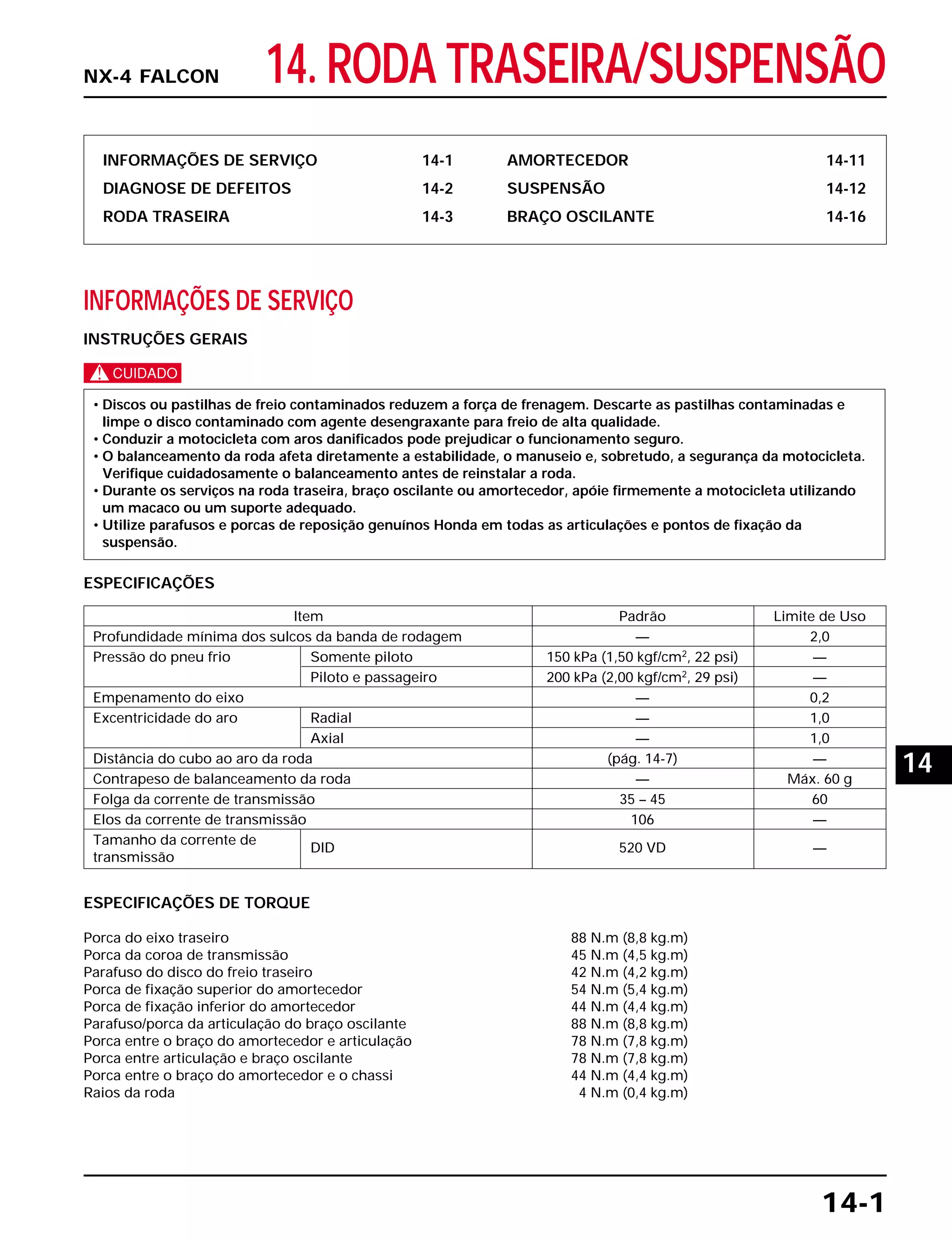 O documento fornece instruções de serviço para a roda traseira e suspensão de uma motocicleta, incluindo especificações técnicas, diagnóstico de defeitos, remoção e instalação de componentes, e balanceamento da roda.