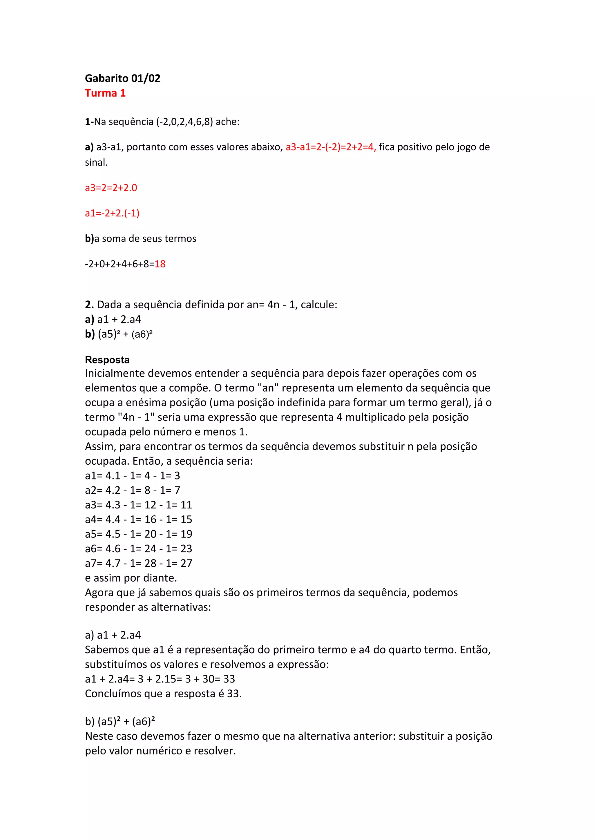 O documento apresenta uma sequência de exercícios de matemática resolvidos. No primeiro exercício, é calculado o termo a3-a1 de uma sequência e a soma de seus termos. No segundo, calculam-se expressões envolvendo termos de uma sequência definida por an= 4n - 1. O terceiro exercício determina o próximo número de uma sequência dada.