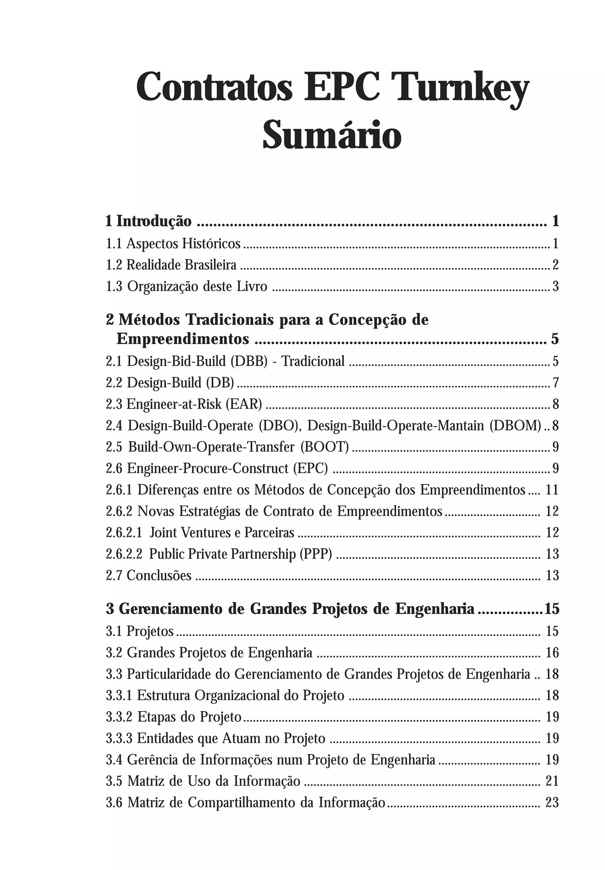 O documento discute os métodos tradicionais de gerenciamento de projetos de engenharia, como Design-Bid-Build e Engineer-Procure-Construct. Ele também aborda tópicos como gerenciamento de contratos, riscos, financiamento e seguros em contratos EPC de entrega total (turnkey). O foco principal é fornecer uma visão geral dos principais aspectos a serem considerados na gestão de grandes projetos de engenharia sob o regime contratual EPC.
