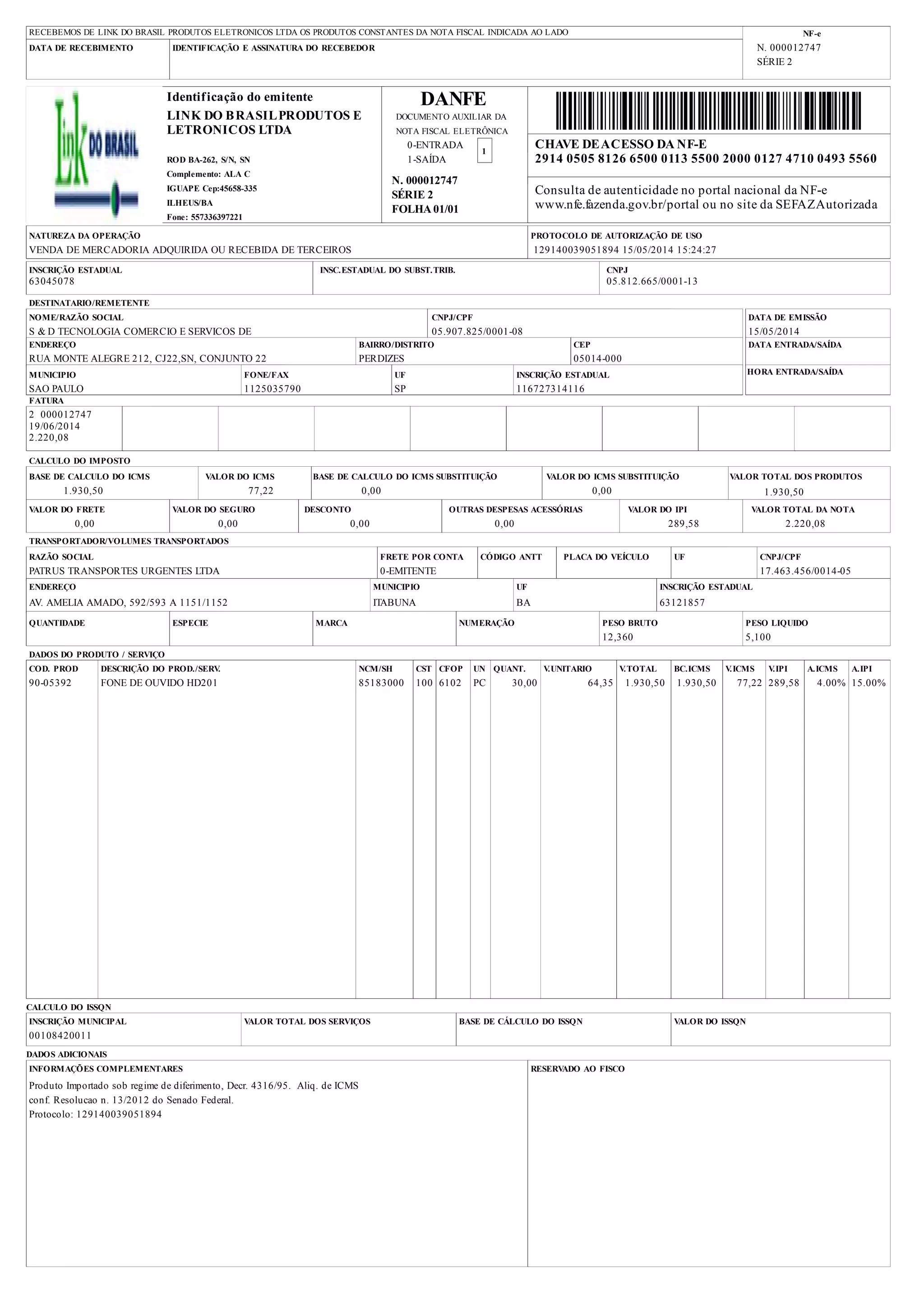O documento é uma nota fiscal eletrônica (NF-e) que registra a venda de 30 fones de ouvido HD201 pela empresa Link do Brasil Produtos Eletrônicos Ltda para a empresa S&D Tecnologia Comércio e Serviços. O valor total da nota é de R$2.220,08, incluindo R$1.930,50 em produtos, R$77,22 em ICMS e R$289,58 em IPI.