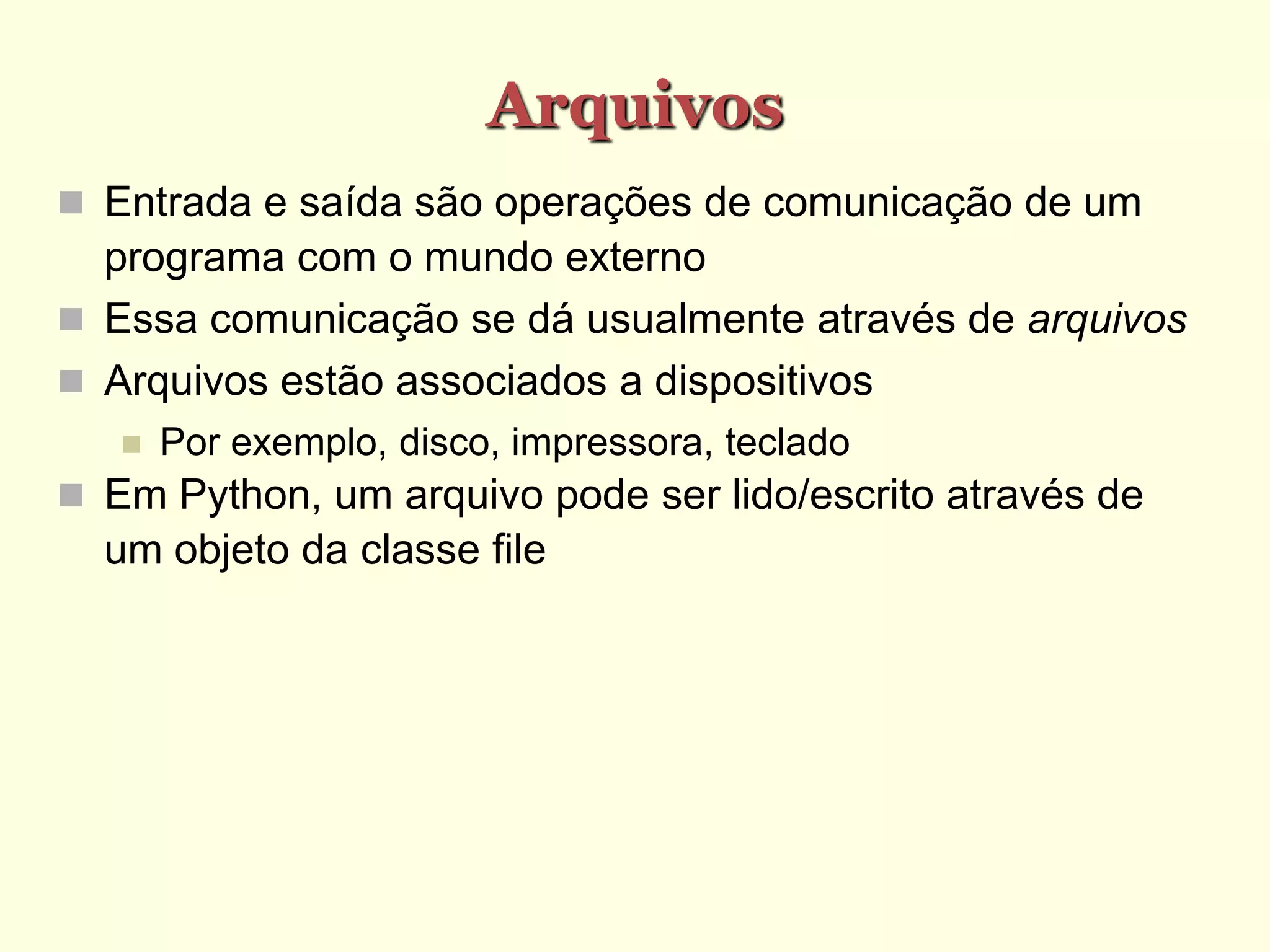 O documento discute entrada e saída em arquivos no Python, incluindo: 1) arquivos padrão sys.stdin, sys.stdout e sys.stderr; 2) abertura, leitura e escrita em arquivos com o objeto file; 3) convenções de fim de linha e pickling para armazenar dados.